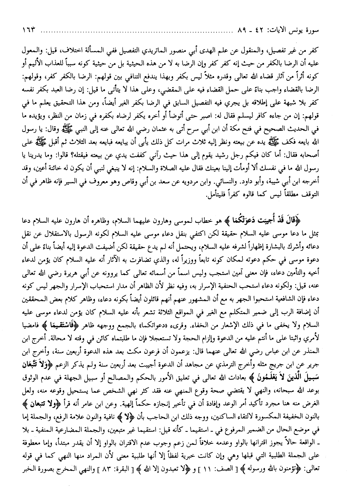 قالَ قَدْ أُجِيبَتْ دَعْوَتُكُما هو خطاب لموسى وهارون عليهما السلام، وظاهره أن هارون عليه السلام دعا بمثل ما دعا موسى عليه السلام حقيقة لكن اكتفي بنقل دعاء موسى عليه السلام لكونه الرسول بالاستقلال عن نقل دعائه وأشرك بالبشارة إظهارا لشرفه عليه السلام، ويحتمل أنه لم يدع حقيقة لكن أضيفت الدعوة إليه أيضا بناء على أن دعوة موسى في حكم دعوته لمكان كونه تابعا ووزيرا له، والذي تضافرت به الآثار أنه عليه السلام كان يؤمن لدعاء أخيه والتأمين دعاء، فإن معنى آمين استجب وليس اسما من أسمائه تعالى كما يروونه عن أبي هريرة رضي الله تعالى عنه، قيل: ولكونه دعاء استحب الحنفية الإسرار به، وفيه نظر لأن الظاهر أن مدار استحباب الإسرار والجهر ليس كونه دعاء فإن الشافعية استحبوا الجهر به مع أن المشهور عنهم أنهم قائلون أيضا بكونه دعاء، وظاهر كلام بعض المحققين أن إضافة الرب إلى ضمير المتكلم مع الغير في المواقع الثلاثة تشعر بأنه عليه السلام كان يؤمن لدعاء موسى عليه السلام ولا يخفى ما في ذلك الإشعار من الخفاء. وقرىء «دعواتكما» بالجمع ووجهه ظاهر فَاسْتَقِيما فامضيا لأمري واثبتا على ما أنتم عليه من الدعوة وإلزام الحجة ولا تستعجلا فإن ما طلبتماه كائن في وقته لا محالة. أخرج ابن المنذر عن ابن عباس رضي الله تعالى عنهما قال: يزعمون أن فرعون مكث بعد هذه الدعوة أربعين سنة، وأخرج ابن جرير عن ابن جريج مثله وأخرج الترمذي عن مجاهد أن الدعوة أجيبت بعد أربعين سنة ولم يذكر الزعم وَلا تَتَّبِعانِّ سَبِيلَ الَّذِينَ لا يَعْلَمُونَ بعادات الله تعالى في تعليق الأمور بالحكم والمصالح أو سبيل الجهلة في عدم الوثوق بوعد الله سبحانه، والنهي لا يقتضي صحة وقوع المنهي عنه فقد كثر نهي الشخص عما يستحيل وقوعه منه، ولعل الغرض منه هنا مجرد تأكيد أمر الوعد وإفادة أن في تأخير إنجازه حكما إلهية. وعن ابن عامر أنه قرأ وَلا تَتَّبِعانِّ بالنون الخفيفة المكسورة لالتقاء الساكنين، ووجه ذلك ابن الحاجب بأن لا نافية والنون علامة الرفع، والجملة إما في موضع الحال من الضمير المرفوع في- استقيما- كأنه قيل: استقيما غير متبعين، والجملة المضارعية المنفية- بلا- الواقعة حالا يجوز اقترانها بالواو وعدمه خلافا لمن زعم وجوب عدم الاقتران بالواو إلا أن يقدر مبتدأ، وإما معطوفة على الجملة الطلبية التي قبلها وهي وإن كانت خبرية لفظا إلا أنها طلبية معنى لأن المراد منها النهي كما في قوله تعالى: تُؤْمِنُونَ بِاللَّهِ وَرَسُولِهِ [الصف: 11] ولا تَعْبُدُونَ إِلَّا اللَّهَ [البقرة: 83] والنهي المخرج بصورة الخبر