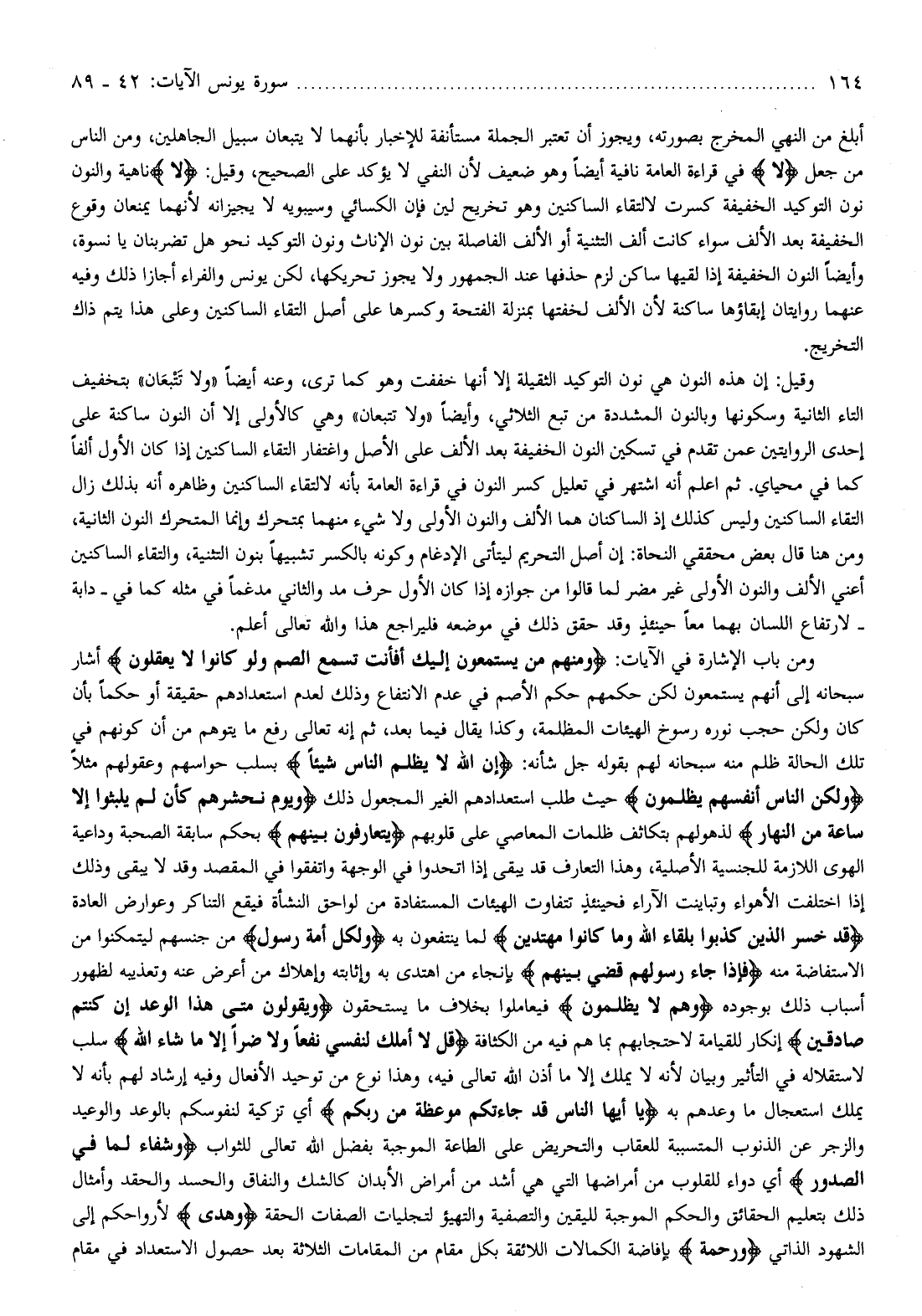 ومن باب الإشارة في الآيات: وَمِنْهُمْ مَنْ يَسْتَمِعُونَ إِلَيْكَ أَفَأَنْتَ تُسْمِعُ الصُّمَّ وَلَوْ كانُوا لا يَعْقِلُونَ أشار سبحانه إلى أنهم يستمعون لكن حكمهم حكم الأصم في عدم الانتفاع وذلك لعدم استعدادهم حقيقة أو حكما بأن كان ولكن حجب نوره رسوخ الهيئات المظلمة، وكذا يقال فيما بعد، ثم إنه تعالى رفع ما يتوهم من أن كونهم في تلك الحالة ظلم منه سبحانه لهم بقوله جل شأنه: إِنَّ اللَّهَ لا يَظْلِمُ النَّاسَ شَيْئاً بسلب حواسهم وعقولهم مثلا وَلكِنَّ النَّاسَ أَنْفُسَهُمْ يَظْلِمُونَ حيث طلب استعدادهم الغير المجعول ذلك وَيَوْمَ يَحْشُرُهُمْ كَأَنْ لَمْ يَلْبَثُوا إِلَّا ساعَةً مِنَ النَّهارِ لذهولهم بتكاثف ظلمات المعاصي على قلوبهم يَتَعارَفُونَ بَيْنَهُمْ بحكم سابقة الصحبة وداعية الهوى اللازمة للجنسية الأصلية، وهذا التعارف قد يبقى إذا اتحدوا في الوجهة واتفقوا في المقصد وقد لا يبقى وذلك إذا اختلفت الأهواء وتباينت الآراء فحينئذ تتفاوت الهيئات المستفادة من لواحق النشأة فيقع التناكر وعوارض العادة قَدْ خَسِرَ الَّذِينَ كَذَّبُوا بِلِقاءِ اللَّهِ وَما كانُوا مُهْتَدِينَ لما ينتفعون به وَلِكُلِّ أُمَّةٍ رَسُولٌ من جنسهم ليتمكنوا من الاستفاضة منه فَإِذا جاءَ رَسُولُهُمْ قُضِيَ بَيْنَهُمْ بإنجاء من اهتدى به وإثابته وإهلاك من أعرض عنه وتعذيبه لظهور أسباب ذلك بوجوده وَهُمْ لا يُظْلَمُونَ فيعاملوا بخلاف ما يستحقون وَيَقُولُونَ مَتى هذَا الْوَعْدُ إِنْ كُنْتُمْ صادِقِينَ إنكار للقيامة لاحتجابهم بما هم فيه من الكثافة قُلْ لا أَمْلِكُ لِنَفْسِي نَفْعاً وَلا ضَرًّا إِلَّا ما شاءَ اللَّهُ سلب لاستقلاله في التأثير وبيان لأنه لا يملك إلا ما أذن الله تعالى فيه، وهذا نوع من توحيد الأفعال وفيه إرشاد لهم بأنه لا يملك استعجال ما وعدهم به يا أَيُّهَا النَّاسُ قَدْ جاءَتْكُمْ مَوْعِظَةٌ مِنْ رَبِّكُمْ أي تزكية لنفوسكم بالوعد والوعيد والزجر عن الذنوب المتسببة للعقاب والتحريض على الطاعة الموجبة بفضل الله تعالى للثواب وَشِفاءٌ لِما فِي الصُّدُورِ أي دواء للقلوب من أمراضها التي هي أشد من أمراض الأبدان كالشك والنفاق والحسد والحقد وأمثال ذلك بتعليم الحقائق والحكم الموجبة لليقين والتصفية والتهيؤ لتجليات الصفات الحقة وَهُدىً لأرواحكم إلى الشهود الذاتي وَرَحْمَةٌ بإفاضة الكمالات اللائقة بكل مقام من المقامات الثلاثة بعد حصول الاستعداد في مقام