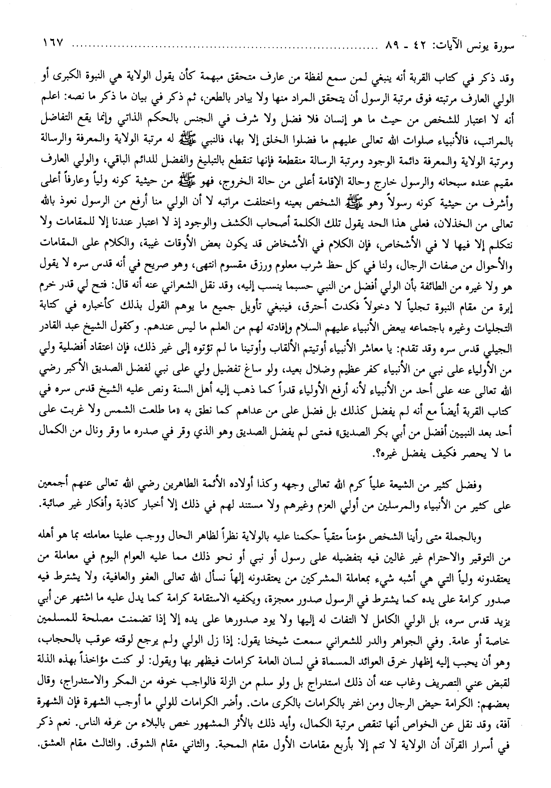 وقد ذكر في كتاب القربة أنه ينبغي لمن سمع لفظة من عارف متحقق مبهمة كأن يقول الولاية هي النبوة الكبرى أو الولي العارف مرتبته فوق مرتبة الرسول أن يتحقق المراد منها ولا يبادر بالطعن، ثم ذكر في بيان ما ذكر ما نصه: اعلم أنه لا اعتبار للشخص من حيث ما هو إنسان فلا فضل ولا شرف في الجنس بالحكم الذاتي وإنما يقع التفاضل بالمراتب، فالأنبياء صلوات الله تعالى عليهم ما فضلوا الخلق إلا بها، فالنبي صلّى الله عليه وسلم له مرتبة الولاية والمعرفة والرسالة ومرتبة الولاية والمعرفة دائمة الوجود ومرتبة الرسالة منقطعة فإنها تنقطع بالتبليغ والفضل للدائم الباقي، والولي العارف مقيم عنده سبحانه والرسول خارج وحالة الإقامة أعلى من حالة الخروج، فهو صلّى الله عليه وسلم من حيثية كونه وليا وعارفا أعلى وأشرف من حيثية كونه رسولا وهو صلّى الله عليه وسلم الشخص بعينه واختلفت مراتبه لا أن الولي منا أرفع من الرسول نعوذ بالله تعالى من الخذلان، فعلى هذا الحد يقول تلك الكلمة أصحاب الكشف والوجود إذ لا اعتبار عندنا إلا للمقامات ولا نتكلم إلا فيها لا في الأشخاص، فإن الكلام في الأشخاص قد يكون بعض الأوقات غيبة، والكلام على المقامات والأحوال من صفات الرجال، ولنا في كل حظ شرب معلوم ورزق مقسوم انتهى، وهو صريح في أنه قدس سره لا يقول هو ولا غيره من الطائفة بأن الولي أفضل من النبي حسبما ينسب إليه، وقد نقل الشعراني عنه أنه قال: فتح لي قدر خرم إبرة من مقام النبوة تجليا لا دخولا فكدت أحترق، فينبغي تأويل جميع ما يوهم القول بذلك كأخباره في كتابة التجليات وغيره باجتماعه ببعض الأنبياء عليهم السلام وإفادته لهم من العلم ما ليس عندهم. وكقول الشيخ عبد القادر الجيلي قدس سره وقد تقدم: يا معاشر الأنبياء أوتيتم الألقاب وأوتينا ما لم تؤتوه إلى غير ذلك، فإن اعتقاد أفضلية ولي من الأولياء على نبي من الأنبياء كفر عظيم وضلال بعيد، ولو ساغ تفضيل ولي على نبي لفضل الصديق الأكبر رضي الله تعالى عنه على أحد من الأنبياء لأنه أرفع الأولياء قدرا كما ذهب إليه أهل السنة ونص عليه الشيخ قدس سره في كتاب القربة أيضا مع أنه لم يفضل كذلك بل فضل على من عداهم كما نطق به «ما طلعت الشمس ولا غربت على أحد بعد النبيين أفضل من أبي بكر الصديق» فمتى لم يفضل الصديق وهو الذي وقر في صدره ما وقر ونال من الكمال ما لا يحصر فكيف يفضل غيره؟.