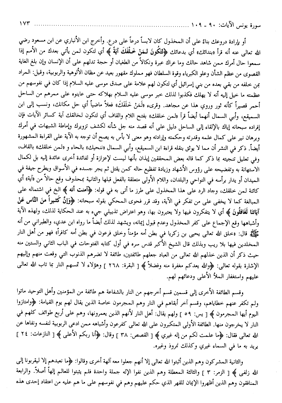 أو بإرادة دروعك بناء على أن المخذول كان لابسا درعا على درع. وأخرج ابن الأنباري عن ابن مسعود رضي الله تعالى عنه أنه قرأ «بندائك» أي بدعائك لِتَكُونَ لِمَنْ خَلْفَكَ آيَةً أي لتكون لمن يأتي بعدك من الأمم إذا سمعوا حال أمرك ممن شاهد حالك وما عراك عبرة ونكالا من الطغيان أو حجة تدلهم على أن الإنسان وإن بلغ الغاية القصوى من عظم الشأن وعلو الكبرياء وقوة السلطان فهو مملوك مقهور بعيد عن مظان الألوهية والربوبية، وقيل: المراد بمن خلفه من بقي بعده من بني إسرائيل أي لتكون لهم علامة على صدق موسى عليه السلام إذا كان في نفوسهم من عظمته ما خيل إليه أنه لا يهلك فكذبوا لذلك خبر موسى عليه السلام بهلاكه حتى عاينوه على ممرهم من الساحل أحمر قصيرا كأنه ثور وروي هذا عن مجاهد. وقرىء «لمن خلفك» فعلا ماضيا أي حل مكانك، ونسب إلى ابن السميقع، وأبي السمال أنهما أيضا قرآ «لمن خلقك» بفتح اللام والقاف أي لتكون لخالقك آية كسائر الآيات فإن إفراده سبحانه إياك بالإلقاء إلى الساحل دليل على أنه قصد منه جل شأنه لكشف تزويرك وإماطة الشبهات في أمرك وبرهان نير على كمال علمه وقدرته وحكمته وإرادته وهو معنى لا بأس به يصح أن توجه به الآية على القراءة المشهورة أيضا. ذكر في النشر أن مما لا يوثق بنقله قراءة ابن السميقع، وأبي السمال «ننحيك» بالحاء و «لمن خلقك» بالقاف، وفي تعليل تنجيته بما ذكر كما قاله بعض المحققين إيذان بأنها ليست لإعزازة أو لفائدة أخرى عائدة إليه بل لكمال الاستهانة به وتفضيحه على رؤوس الأشهاد وزيادة تفظيع حاله كمن يقتل ثم يجر جسده في الأسواق ويطرح جيفة في الميدان أو يدار برأسه في النواحي والبلدان، واللام الأولى متعلقة بالفعل قبلها والثانية بمحذوف وقع حالا من «آية» أي كائنة لمن خلقك، وجاد الرد على هذا المخذول على طرز ما أتى به في قوله: آمَنْتُ أَنَّهُ إلخ في اشتماله على المبالغة كما لا يخفى على من تفكر في الآية، وقد قرر فحوى المحكي بقوله سبحانه: وَإِنَّ كَثِيراً مِنَ النَّاسِ عَنْ آياتِنا لَغافِلُونَ أي لا يتفكرون فيها ولا يعتبرون بها، وهو اعتراض تذييلي جيء به عند الحكاية لذلك، ولهذه الآية وأشباهها وقع الإجماع على كفر المخذول وعدم قبول إيمانه، ويشهد لذلك أيضا ما