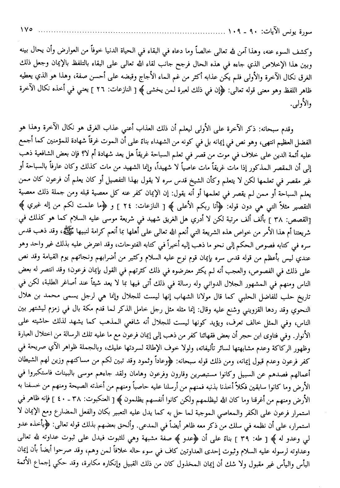 وكشف السوء عنه، وهذا آمن لله تعالى خالصا وما دعاه في البقاء في الحياة الدنيا خوفا من العوارض وأن يحال بينه وبين هذا الإخلاص الذي جاءه في هذه الحال فرجح جانب لقاء الله تعالى على البقاء بالتلفظ بالإيمان وجعل ذلك الغرق نكال الآخرة والأولى فلم يكن عذابه أكثر من غم الماء الأجاج وقبضه على أحسن صفة، وهذا هو الذي يعطيه ظاهر اللفظ وهو معنى قوله تعالى: إِنَّ فِي ذلِكَ لَعِبْرَةً لِمَنْ يَخْشى [النازعات: 26] يعني في أخذه نكال الآخرة والأولى.