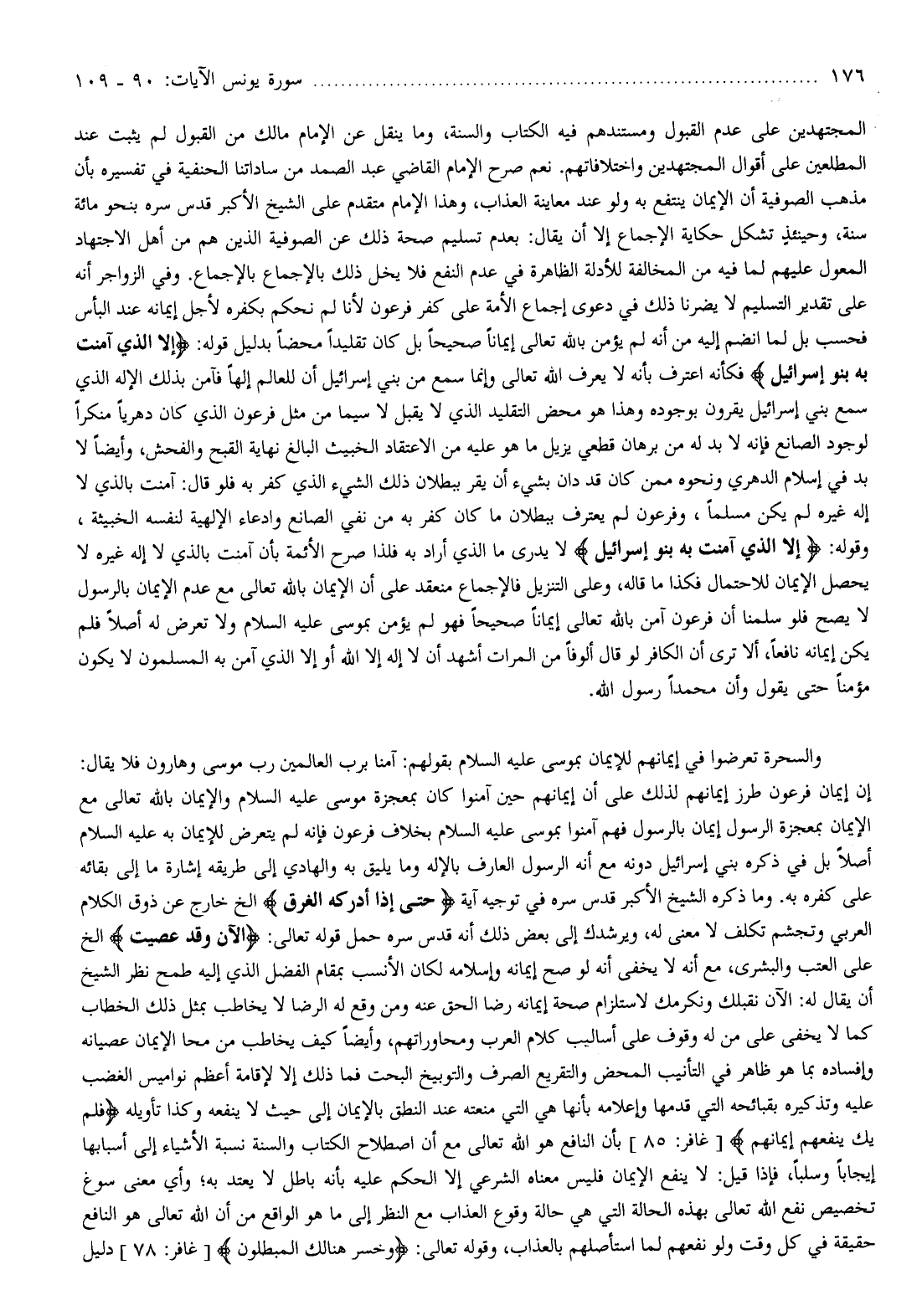 إن إيمان فرعون طرز إيمانهم لذلك على أن إيمانهم حين آمنوا كان بمعجزة موسى عليه السلام والإيمان بالله تعالى مع الإيمان بمعجزة الرسول إيمان بالرسول فهم آمنوا بموسى عليه السلام بخلاف فرعون فإنه لم يتعرض للإيمان به عليه السلام أصلا بل في ذكره بني إسرائيل دونه مع أنه الرسول العارف بالإله وما يليق به والهادي إلى طريقه إشارة ما إلى بقائه على كفره به. وما ذكره الشيخ الأكبر قدس سره في توجيه آية حَتَّى إِذا أَدْرَكَهُ الْغَرَقُ إلخ خارج عن ذوق الكلام العربي وتجشم تكلف لا معنى له، ويرشدك إلى بعض ذلك أنه قدس سره حمل قوله تعالى: آلْآنَ وَقَدْ عَصَيْتَ إلخ على العتب والبشرى، مع أنه لا يخفى أنه لو صح إيمانه وإسلامه لكان الأنسب بمقام الفضل الذي إليه طمح نظر الشيخ أن يقال له: الآن نقبلك ونكرمك لاستلزام صحة إيمانه رضا الحق عنه ومن وقع له الرضا لا يخاطب بمثل ذلك الخطاب كما لا يخفى على من له وقوف على أساليب كلام العرب ومحاوراتهم، وأيضا كيف يخاطب بمثل ذلك الخطاب كما لا يخفى على من له وقوف على أساليب كلام العرب ومحاوراتهم، وأيضا كيف يخاطب من محا الإيمان عصيانه وإفساده بما هو ظاهر في التأنيب المحض والتقريع الصرف والتوبيخ البحت فما ذلك إلا لإقامة أعظم نواميس الغضب عليه وتذكيره بقبائحه التي قدمها وإعلامه بأنها هي التي منعته عند النطق بالإيمان إلى حيث لا ينفعه وكذا تأويله فَلَمْ يَكُ يَنْفَعُهُمْ إِيمانُهُمْ [غافر: 85] بأن النافع هو الله تعالى مع أن اصطلاح الكتاب والسنة نسبة الأشياء إلى أسبابها إيجابا وسلبا، فإذا قيل: لا ينفع الإيمان فليس معناه الشرعي إلا الحكم عليه بأنه باطل لا يعتد به وأي معنى سوغ تخصيص نفع الله تعالى بهذه الحالة التي هي حالة وقوع العذاب مع النظر إلى ما هو الواقع من أن الله تعالى هو النافع حقيقة في كل وقت ولو نفعهم لما استأصلهم بالعذاب، وقوله تعالى: وَخَسِرَ هُنالِكَ الْمُبْطِلُونَ [غافر: 78] دليل