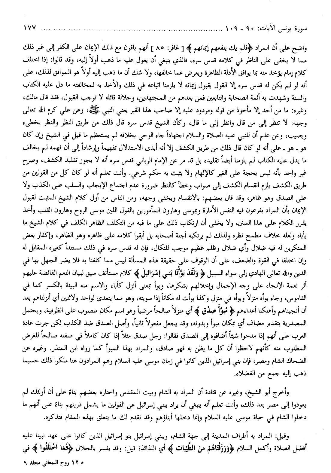 وكأن الشيخ قدس سره قال ذلك من طريق النظر والنظر يخطىء ويصيب، وعن علم أن للنبي عليه الصلاة والسلام اجتهادا جاء الوحي بخلافه لم يستعظم ما قيل في الشيخ وإن كان هو- هو- على أنه لو كان قال ذلك من طريق الكشف إلا أنه أبدى الاستدلال تفهيما وإرشادا إلى أن فهمه لم يخالف ما يدل عليه الكتاب لم يلزمنا أيضا تقليده بل قد مر عن الإمام الرباني قدس سره أنه لا يجوز تقليد الكشف، وصرح غير واحد بأنه ليس بحجة على الغير كالإلهام ولا يثبت به حكم شرعي. وأنت تعلم أنه لو كان كل من القولين من طريق الكشف يلزم انقسام الكشف إلى صواب وخطأ كالنظر ضرورة عدم اجتماع الإيجاب والسلب على الكذب ولا على الصدق وهو ظاهر، وقد قال بعضهم: بالانقسام ويخفى وجهه، ومن الناس من أول كلام الشيخ المثبت لقبول الإيمان بأن المراد بفرعون فيه النفس الأمارة وبموسى وهارون المأمورين بالقول اللين موسى الروح وهارون القلب وأخذ يقرر الكلام على هذا السنن، ولا يخفى أن ارتكاب ذلك على ما فيه من التكلف الظاهر الكلف في كلام الشيخ ما يأباه ولعله خلاف مطمح نظره ولذلك لم يرتكبه أجلة أصحابه بل أبقوا كلامه على ظاهره وهو الظاهر، وإكفار بعض المنكرين له فيه ضلال وأي ضلال وظلم عظيم موجب للنكال، فإن له قدس سره في ذلك مستندا كغيره المقابل له وإن اختلفا في القوة والضعف، على أن الوقوف على حقيقة هذه المسألة ليس مما كلفنا به فلا يضر الجهل بها في الدين والله تعالى الهادي إلى سواء السبيل وَلَقَدْ بَوَّأْنا بَنِي إِسْرائِيلَ كلام مستأنف سيق لبيان النعم الفائضة عليهم أثر نعمة الإنجاء على وجه الإجمال وإخلالهم بشكرها، وبوأ بمعنى أنزل كأباء والاسم منه البيئة بالكسر كما في القاموس، وجاء بوأه منزلا وبوأه في منزل وكذا بوأت له مكانا إذا سويته، وهو مما يتعدى لواحد ولاثنين أي أنزلناهم بعد أن أنجيناهم وأهلكنا أعداءهم مُبَوَّأَ صِدْقٍ أي منزلا صالحا مرضيا وهو اسم مكان منصوب على الظرفية، ويحتمل المصدرية بتقدير مضاف أي بمكان مبوأ وبدونه، وقد يجعل مفعولا ثانيا، وأصل الصدق ضد الكذب لكن جرت عادة العرب على أنهم إذا مدحوا شيئا أضافوه إلى الصدق فقالوا: رجل صدق مثلا إذا كان كاملا في صفته صالحا للغرض المطلوب منه كأنهم لاحظوا أن كل ما يظن به فهو صادق، والمراد بهذا المبوأ كما رواه ابن المنذر. وغيره عن الضحاك الشام ومصر، فإن بني إسرائيل الذين كانوا في زمان موسى عليه السلام وهم المرادون هنا ملكوا ذلك حسبما ذهب إليه جمع من الفضلاء.