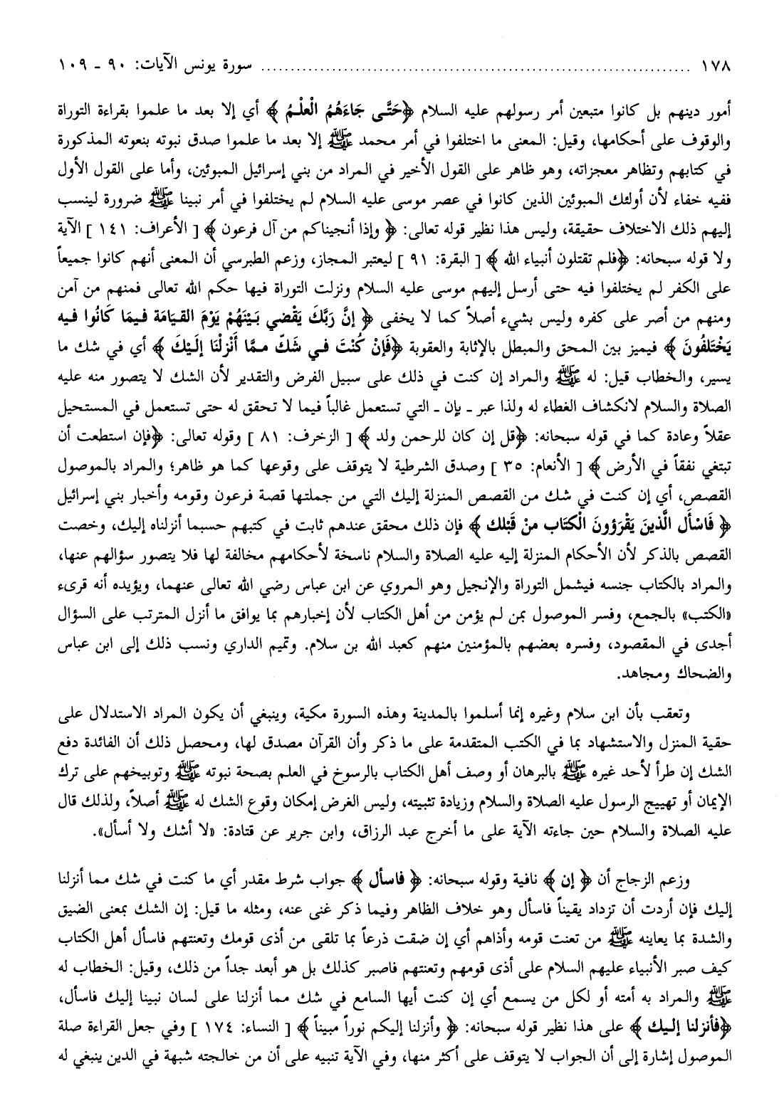 وزعم الزجاج أن إن نافية وقوله سبحانه: فَسْئَلِ جواب شرط مقدر أي ما كنت في شك مما أنزلنا إليك فإن أردت أن تزداد يقينا فاسأل وهو خلاف الظاهر وفيما ذكر غنى عنه، ومثله ما قيل: إن الشك بمعنى الضيق والشدة بما يعاينه صلّى الله عليه وسلم من تعنت قومه وأذاهم أي إن ضقت ذرعا بما تلقى من أذى قومك وتعنتهم فاسأل أهل الكتاب كيف صبر الأنبياء عليهم السلام على أذى قومهم وتعنتهم فاصبر كذلك بل هو أبعد جدا من ذلك، وقيل: الخطاب له صلّى الله عليه وسلم والمراد به أمته أو لكل من يسمع أي إن كنت أيها السامع في شك مما أنزلنا على لسان نبينا إليك فاسأل، أَنْزَلْنا إِلَيْكَ على هذا نظير قوله سبحانه: وَأَنْزَلْنا إِلَيْكُمْ نُوراً مُبِيناً [النساء: 174] وفي جعل القراءة صلة الموصول إشارة إلى أن الجواب لا يتوقف على أكثر منها، وفي الآية تنبيه على أن من خالجته شبهة في الدين ينبغي له