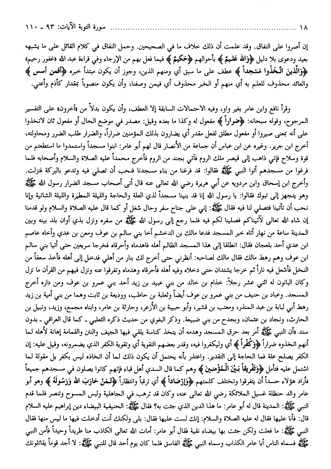 إن أصروا على النفاق. وقد علمت أن ذلك خلاف ما في الصحيحين. وحمل النفاق في كلام القائل على ما يشبهه بعيد ودعوى بلا دليل وَاللَّهُ عَلِيمٌ بأحوالهم حَكِيمٌ فيما فعل بهم من الإرجاء وفي قراءة عبد الله «غفور رحيم» وَالَّذِينَ اتَّخَذُوا مَسْجِداً عطف على ما سبق أي ومنهم الذين، وجوز أن يكون مبتدأ خبره أَفَمَنْ أَسَّسَ والعائد محذوف للعلم به أي منهم أو الخبر محذوف أي فيمن وصفنا، وأن يكون منصوبا بمقدار كأذم وأعني.
