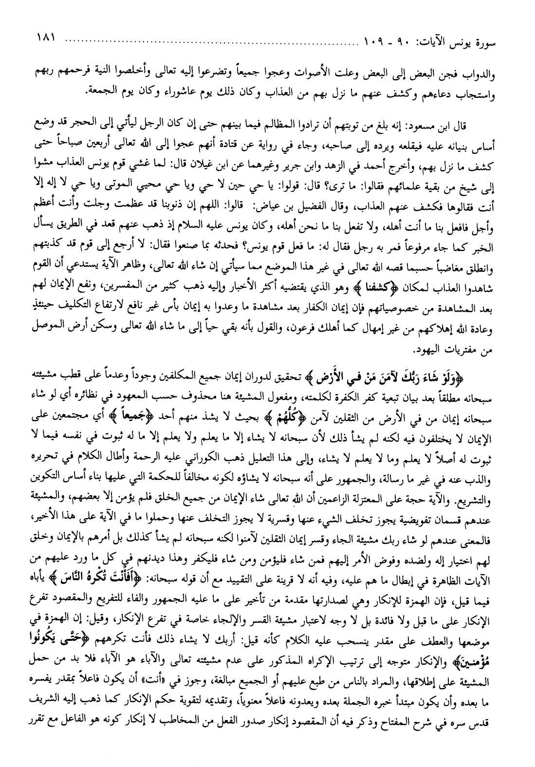 وَلَوْ شاءَ رَبُّكَ لَآمَنَ مَنْ فِي الْأَرْضِ تحقيق لدوران إيمان جميع المكلفين وجودا وعدما على قطب مشيئته سبحانه مطلقا بعد بيان تبعية كفر الكفرة لكلمته، ومفعول المشيئة هنا محذوف حسب المعهود في نظائره أي لو شاء سبحانه إيمان من في الأرض من الثقلين لآمن كُلُّهُمْ بحيث لا يشذ منهم أحد جَمِيعاً أي مجتمعين على الإيمان لا يختلفون فيه لكنه لم يشأ ذلك لأن سبحانه لا يشاء إلا ما يعلم ولا يعلم إلا ما له ثبوت في نفسه فيما لا ثبوت له أصلا لا يعلم وما لا يعلم لا يشاء، وإلى هذا التعليل ذهب الكوراني عليه الرحمة وأطال الكلام في تحريره والذب عنه في غير ما رسالة، والجمهور على أنه سبحانه لا يشاؤه لكونه مخالفا للحكمة التي عليها بناء أساس التكوين والتشريع. والآية حجة على المعتزلة الزاعمين أن الله تعالى شاء الإيمان من جميع الخلق فلم يؤمن إلا بعضهم، والمشيئة عندهم قسمان تفويضية يجوز تخلف الشيء عنها وقسرية لا يجوز التخلف عنها وحملوا ما في الآية على هذا الأخير، فالمعنى عندهم لو شاء ربك مشيئة الجاء وقسر إيمان الثقلين لآمنوا لكنه سبحانه لم يشأ كذلك بل أمرهم بالإيمان وخلق لهم اختيار إله ولضده وفوض الأمر إليهم فمن شاء فليؤمن ومن شاء فليكفر وهذا دينهم في كل ما ورد عليهم من الآيات الظاهرة في إبطال ما هم عليه، وفيه أنه لا قرينة على التقييد مع أن قوله سبحانه: أَفَأَنْتَ تُكْرِهُ النَّاسَ يأباه فيما قيل، فإن الهمزة للإنكار وهي لصدارتها مقدمة من تأخير على ما عليه الجمهور والفاء للتفريع والمقصود تفرع الإنكار على ما قبل ولا فائدة بل لا وجه لاعتبار مشيئة القسر والإلجاء خاصة في تفرع الإنكار، وقيل: إن الهمزة في موضعها والعطف على مقدر ينسحب عليه الكلام كأنه قيل: أربك لا يشاء ذلك فأنت تكرههم حَتَّى يَكُونُوا مُؤْمِنِينَ والإنكار متوجه إلى ترتيب الإكراه المذكور على عدم مشيئته تعالى والآباء هو الآباء فلا بد من حمل المشيئة على إطلاقها، والمراد بالناس من طبع عليهم أو الجميع مبالغة، وجوز في «أنت» أن يكون فاعلا بمقدر يفسره ما بعده وأن يكون مبتدأ خبره الجملة بعده ويعدونه فاعلا معنويا، وتقديمه لتقوية حكم الإنكار كما ذهب إليه الشريف قدس سره في شرح المفتاح وذكر فيه أن المقصود إنكار صدور الفعل من المخاطب لا إنكار كونه هو الفاعل مع تقرر