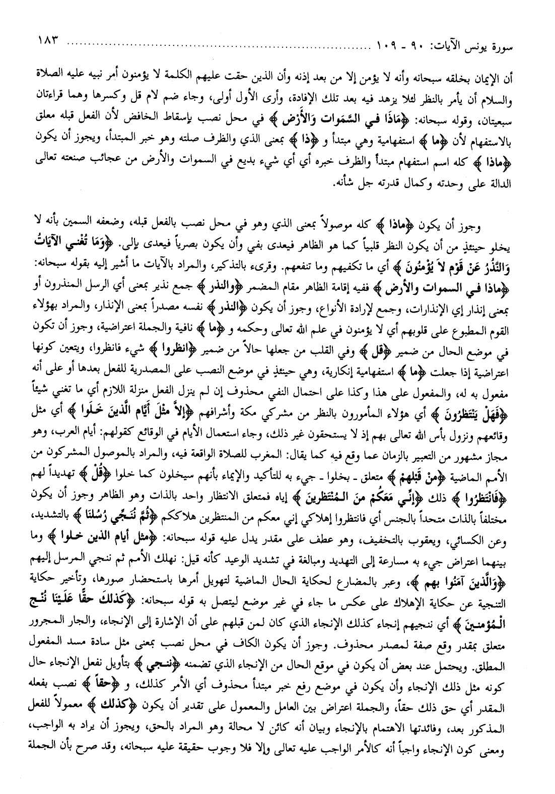 ماذا فِي السَّماواتِ وَالْأَرْضِ ففيه إقامة الظاهر مقام المضمر وَالنُّذُرُ جمع نذير بمعنى أي الرسل المنذرون أو بمعنى إنذار إي الإنذارات، وجمع لإرادة الأنواع، وجوز أن يكون النُّذُرُ نفسه مصدرا بمعنى الإنذار، والمراد بهؤلاء القوم المطبوع على قلوبهم أي لا يؤمنون في علم الله تعالى وحكمه وما نافية والجملة اعتراضية، وجوز أن يكون في موضع الحال من ضمير قُلِ وفي القلب من جعلها حالا من ضمير انْظُرُوا شيء فانظروا، ويتعين كونها اعتراضية إذا جعلت ما استفهامية إنكارية، وهي حينئذ في موضع النصب على المصدرية للفعل بعدها أو على أنه مفعول به له، والمفعول على هذا وكذا على احتمال النفي محذوف إن لم ينزل الفعل منزلة اللازم أي ما تغني شيئا فَهَلْ يَنْتَظِرُونَ أي هؤلاء المأمورون بالنظر من مشركي مكة وأشرافهم إِلَّا مِثْلَ أَيَّامِ الَّذِينَ خَلَوْا أي مثل وقائعهم ونزول بأس الله تعالى بهم إذ لا يستحقون غير ذلك، وجاء استعمال الأيام في الوقائع كقولهم: أيام العرب، وهو مجاز مشهور من التعبير بالزمان عما وقع فيه كما يقال: المغرب للصلاة الواقعة فيه، والمراد بالموصول المشركون من الأمم الماضية مِنْ قَبْلِهِمْ متعلق- بخلوا- جيء به للتأكيد والإيماء بأنهم سيخلون كما خلوا قُلْ تهديدا لهم فَانْتَظِرُوا ذلك إِنِّي مَعَكُمْ مِنَ الْمُنْتَظِرِينَ إياه فمتعلق الانتظار واحد بالذات وهو الظاهر وجوز أن يكون مختلفا بالذات متحدا بالجنس أي فانتظروا إهلاكي إني معكم من المنتظرين هلاككم ثُمَّ نُنَجِّي رُسُلَنا بالتشديد، وعن الكسائي، ويعقوب بالتخفيف، وهو عطف على مقدر يدل عليه قوله سبحانه: مِثْلَ أَيَّامِ الَّذِينَ خَلَوْا وما بينهما اعتراض جيء به مسارعة إلى التهديد ومبالغة في تشديد الوعيد كأنه قيل: نهلك الأمم ثم ننجي المرسل إليهم وَالَّذِينَ آمَنُوا بهم، وعبر بالمضارع لحكاية الحال الماضية لتهويل أمرها باستحضار صورها، وتأخير حكاية التنجية عن حكاية الإهلاك على عكس ما جاء في غير موضع ليتصل به قوله سبحانه: كَذلِكَ حَقًّا عَلَيْنا نُنْجِ الْمُؤْمِنِينَ أي ننجيهم إنجاء كذلك الإنجاء الذي كان لمن قبلهم على أن الإشارة إلى الإنجاء، والجار المجرور متعلق بمقدر وقع صفة لمصدر محذوف. وجوز أن يكون الكاف في محل نصب بمعنى مثل سادة مسد المفعول المطلق. ويحتمل عند بعض أن يكون في موقع الحال من الإنجاء الذي تضمنه نُنَجِّي بتأويل نفعل الإنجاء حال كونه مثل ذلك الإنجاء وأن يكون في موضع رفع خبر مبتدأ محذوف أي الأمر كذلك، وحَقًّا نصب بفعله المقدر أي حق ذلك حقا، والجملة اعتراض بين العامل والمعمول على تقدير أن يكون كَذلِكَ معمولا للفعل المذكور بعد، وفائدتها الاهتمام بالإنجاء وبيان أنه كائن لا محالة وهو المراد بالحق، ويجوز أن يراد به الواجب، ومعنى كون الإنجاء واجبا أنه كالأمر الواجب عليه تعالى وإلا فلا وجوب حقيقة عليه سبحانه، وقد صرح بأن الجملة