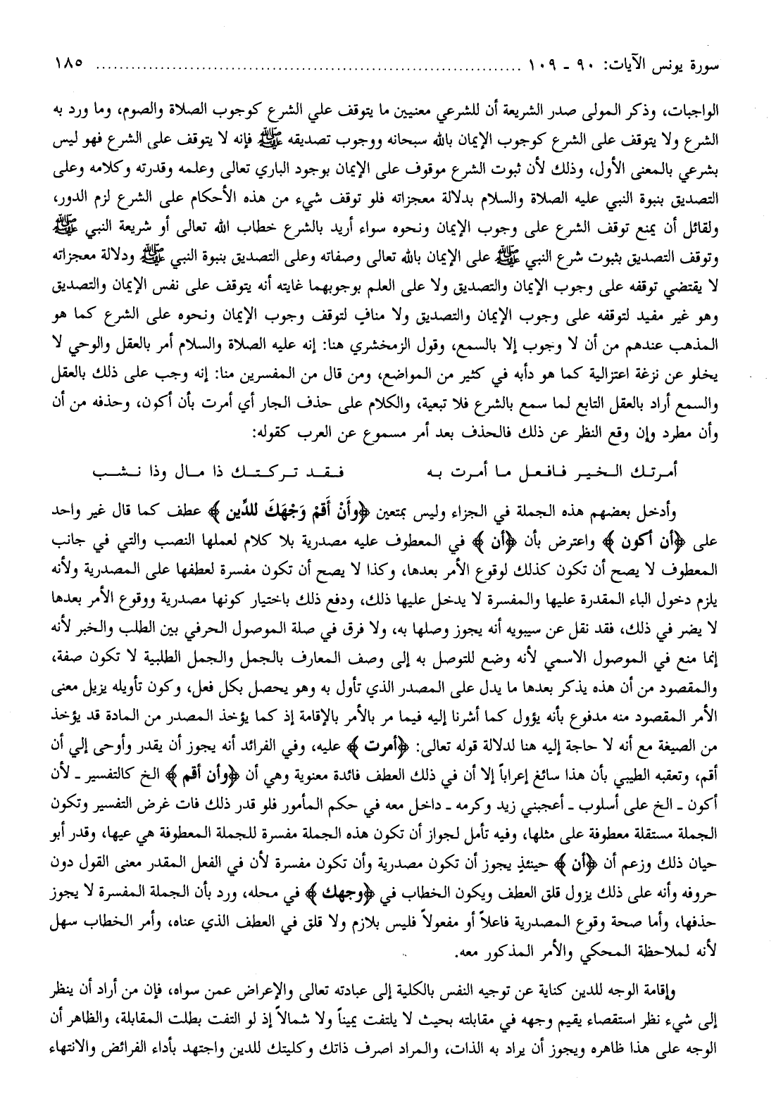 وأدخل بعضهم هذه الجملة في الجزاء وليس بمتعين وَأَنْ أَقِمْ وَجْهَكَ لِلدِّينِ عطف كما قال غير واحد على أَنْ أَكُونَ واعترض بأن إِنْ في المعطوف عليه مصدرية بلا كلام لعملها النصب والتي في جانب المعطوف لا يصح أن تكون كذلك لوقوع الأمر بعدها، وكذا لا يصح أن تكون مفسرة لعطفها على المصدرية ولأنه يلزم دخول الباء المقدرة عليها والمفسرة لا يدخل عليها ذلك، ودفع ذلك باختيار كونها مصدرية ووقوع الأمر بعدها لا يضر في ذلك، فقد نقل عن سيبويه أنه يجوز وصلها به، ولا فرق في صلة الموصول الحرفي بين الطلب والخبر لأنه إنما منع في الموصول الاسمي لأنه وضع للتوصل به إلى وصف المعارف بالجمل والجمل الطلبية لا تكون صفة، والمقصود من أن هذه يذكر بعدها ما يدل على المصدر الذي تأول به وهو يحصل بكل فعل، وكون تأويله يزيل معنى الأمر المقصود منه مدفوع بأنه يؤول كما أشرنا إليه فيما مر بالأمر بالإقامة إذ كما يؤخذ المصدر من المادة قد يؤخذ من الصيغة مع أنه لا حاجة إليه هنا لدلالة قوله تعالى: أُمِرْتُ عليه، وفي الفرائد أنه يجوز أن يقدر وأوحى إلي أن أقم، وتعقبه الطيبي بأن هذا سائغ إعرابا إلا أن في ذلك العطف فائدة معنوية وهي أن وَأَنْ أَقِمْ إلخ كالتفسير- لأن أكون- إلخ على أسلوب- أعجبني زيد وكرمه- داخل معه في حكم المأمور فلو قدر ذلك فات غرض التفسير وتكون الجملة مستقلة معطوفة على مثلها، وفيه تأمل لجواز أن تكون هذه الجملة مفسرة للجملة المعطوفة هي عيها، وقدر أبو حيان ذلك وزعم أن أَنْ حينئذ يجوز أن تكون مصدرية وأن تكون مفسرة لأن في الفعل المقدر معنى القول دون حروفه وأنه على ذلك يزول قلق العطف ويكون الخطاب في وَجْهَكَ في محله، ورد بأن الجملة المفسرة لا يجوز حذفها، وأما صحة وقوع المصدرية فاعلا أو مفعولا فليس بلازم ولا قلق في العطف الذي عناه، وأمر الخطاب سهل لأنه لملاحظة المحكي والأمر المذكور معه.