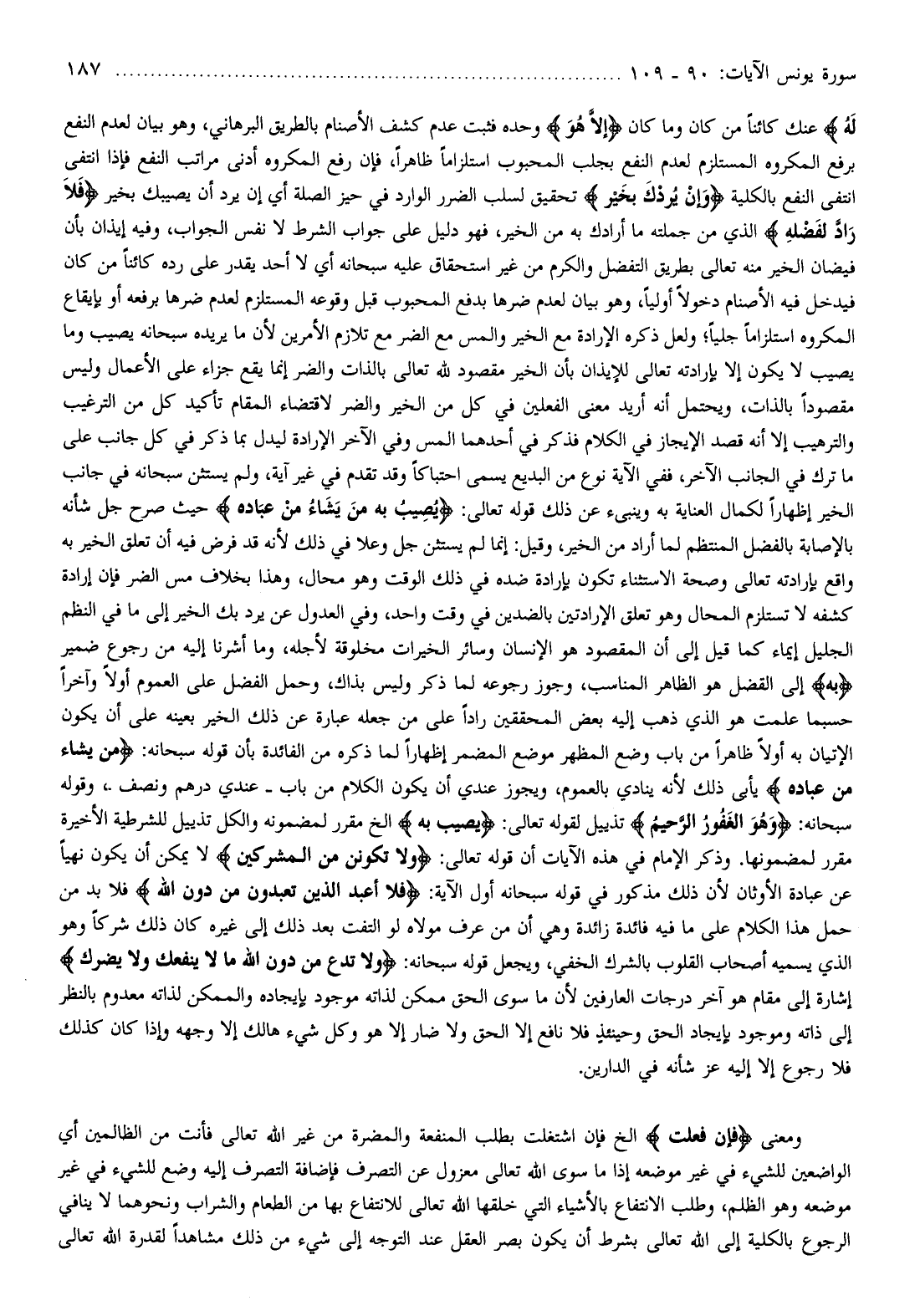 عنك كائنا من كان وما كان إِلَّا هُوَ وحده فثبت عدم كشف الأصنام بالطريق البرهاني، وهو بيان لعدم النفع برفع المكروه المستلزم لعدم النفع بجلب المحبوب استلزاما ظاهرا، فإن رفع المكروه أدنى مراتب النفع فإذا انتفى انتفى النفع بالكلية وَإِنْ يُرِدْكَ بِخَيْرٍ تحقيق لسلب الضرر الوارد في حيز الصلة أي إن يرد أن يصيبك بخير فَلا رَادَّ لِفَضْلِهِ الذي من جملته ما أرادك به من الخير، فهو دليل على جواب الشرط لا نفس الجواب، وفيه إيذان بأن فيضان الخير منه تعالى بطريق التفضل والكرم من غير استحقاق عليه سبحانه أي لا أحد يقدر على رده كائنا من كان فيدخل فيه الأصنام دخولا أوليا، وهو بيان لعدم ضرها بدفع المحبوب قبل وقوعه المستلزم لعدم ضرها برفعه أو بإيقاع المكروه استلزاما جليا ولعل ذكره الإرادة مع الخير والمس مع الضر مع تلازم الأمرين لأن ما يريده سبحانه يصيب وما يصيب لا يكون إلا بإرادته تعالى للإيذان بأن الخير مقصود لله تعالى بالذات والضر إنما يقع جزاء على الأعمال وليس مقصودا بالذات، ويحتمل أنه أريد معنى الفعلين في كل من الخير والضر لاقتضاء المقام تأكيد كل من الترغيب والترهيب إلا أنه قصد الإيجاز في الكلام فذكر في أحدهما المس وفي الآخر الإرادة ليدل بما ذكر في كل جانب على ما ترك في الجانب الآخر، ففي الآية نوع من البديع يسمى احتباكا وقد تقدم في غير آية، ولم يستثن سبحانه في جانب الخير إظهارا لكمال العناية به وينبىء عن ذلك قوله تعالى: يُصِيبُ بِهِ مَنْ يَشاءُ مِنْ عِبادِهِ حيث صرح جل شأنه بالإصابة بالفضل المنتظم لما أراد من الخير، وقيل: إنما لم يستثن جل وعلا في ذلك لأنه قد فرض فيه أن تعلق الخير به واقع بإرادته تعالى وصحة الاستثناء تكون بإرادة ضده في ذلك الوقت وهو محال، وهذا بخلاف مس الضر فإن إرادة كشفه لا تستلزم المحال وهو تعلق الإرادتين بالضدين في وقت واحد، وفي العدول عن يرد بك الخير إلى ما في النظم الجليل إيماء كما قيل إلى أن المقصود هو الإنسان وسائر الخيرات مخلوقة لأجله، وما أشرنا إليه من رجوع ضمير بِهِ إلى الفضل هو الظاهر المناسب، وجوز رجوعه لما ذكر وليس بذاك، وحمل الفضل على العموم أولا وآخرا حسبما علمت هو الذي ذهب إليه بعض المحققين رادا على من جعله عبارة عن ذلك الخير بعينه على أن يكون الإتيان به أولا ظاهرا من باب وضع المظهر موضع المضمر إظهارا لما ذكره من الفائدة بأن قوله سبحانه: مَنْ يَشاءُ مِنْ عِبادِهِ يأبى ذلك لأنه ينادي بالعموم، ويجوز عندي أن يكون الكلام من باب- عندي درهم ونصف، وقوله سبحانه: وَهُوَ الْغَفُورُ الرَّحِيمُ تذييل لقوله تعالى: يُصِيبُ بِهِ إلخ مقرر لمضمونه والكل تذييل للشرطية الأخيرة مقرر لمضمونها. وذكر الإمام في هذه الآيات أن قوله تعالى: وَلا تَكُونَنَّ مِنَ الْمُشْرِكِينَ لا يمكن أن يكون نهيا عن عبادة الأوثان لأن ذلك مذكور في قوله سبحانه أول الآية: فَلا أَعْبُدُ الَّذِينَ تَعْبُدُونَ مِنْ دُونِ اللَّهِ فلا بد من حمل هذا الكلام على ما فيه فائدة زائدة وهي أن من عرف مولاه لو التفت بعد ذلك إلى غيره كان ذلك شركا وهو الذي يسميه أصحاب القلوب بالشرك الخفي، ويجعل قوله سبحانه: وَلا تَدْعُ مِنْ دُونِ اللَّهِ ما لا يَنْفَعُكَ وَلا يَضُرُّكَ إشارة إلى مقام هو آخر درجات العارفين لأن ما سوى الحق ممكن لذاته موجود بإيجاده والممكن لذاته معدوم بالنظر إلى ذاته وموجود بإيجاد الحق وحينئذ فلا نافع إلا الحق ولا ضار إلا هو وكل شيء هالك إلا وجهه وإذا كان كذلك فلا رجوع إلا إليه عز شأنه في الدارين.