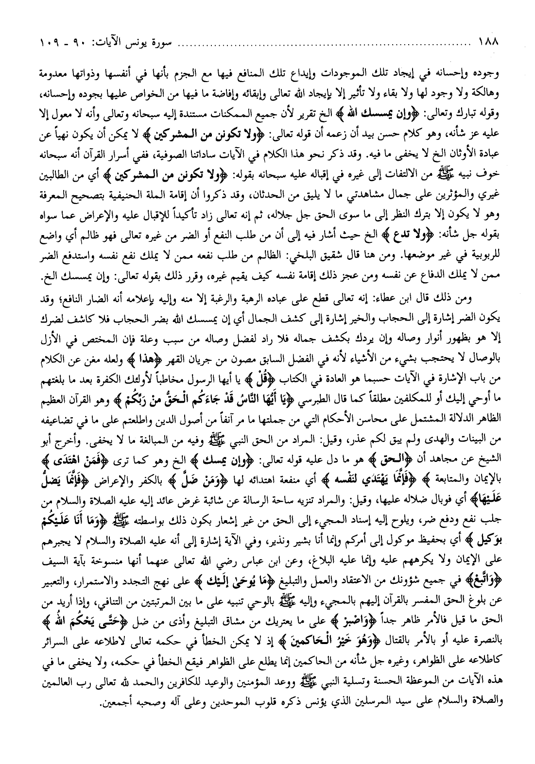 وجوده وإحسانه في إيجاد تلك الموجودات وإيداع تلك المنافع فيها مع الجزم بأنها في أنفسها وذواتها معدومة وهالكة ولا وجود لها ولا بقاء ولا تأثير إلا بإيجاد الله تعالى وإبقائه وإفاضة ما فيها من الخواص عليها بجوده وإحسانه، وقوله تبارك وتعالى: وَإِنْ يَمْسَسْكَ اللَّهُ إلخ تقرير لأن جميع الممكنات مستندة إليه سبحانه وتعالى وأنه لا معول إلا عليه عز شأنه، وهو كلام حسن بيد أن زعمه أن قوله تعالى: وَلا تَكُونَنَّ مِنَ الْمُشْرِكِينَ لا يمكن أن يكون نهيا عن عبادة الأوثان إلخ لا يخفى ما فيه. وقد ذكر نحو هذا الكلام في الآيات ساداتنا الصوفية، ففي أسرار القرآن أنه سبحانه خوف نبيه صلّى الله عليه وسلم من الالتفات إلى غيره في إقباله عليه سبحانه بقوله: وَلا تَكُونَنَّ مِنَ الْمُشْرِكِينَ أي من الطالبين غيري والمؤثرين على جمال مشاهدتي ما لا يليق من الحدثان، وقد ذكروا أن إقامة الملة الحنيفية بتصحيح المعرفة وهو لا يكون إلا بترك النظر إلى ما سوى الحق جل جلاله، ثم إنه تعالى زاد تأكيدا للإقبال عليه والإعراض عما سواه بقوله جل شأنه: وَلا تَدْعُ إلخ حيث أشار فيه إلى أن من طلب النفع أو الضر من غيره تعالى فهو ظالم أي واضع للربوبية في غير موضعها. ومن هنا قال شقيق البلخي: الظالم من طلب نفعه ممن لا يملك نفع نفسه واستدفع الضر ممن لا يملك الدفاع عن نفسه ومن عجز ذلك إقامة نفسه كيف يقيم غيره، وقرر ذلك بقوله تعالى: وإن يمسسك إلخ.
