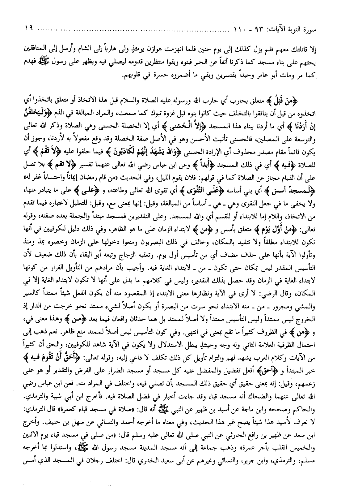 لَمَسْجِدٌ أُسِّسَ أي بني أساسه عَلَى التَّقْوى أي تقوى الله تعالى وطاعته، وعَلَى على ما يتبادر منها، ولا يخفى ما في جعل التقوى وهي- هي- أساسا من المبالغة، وقيل: إنها بمعنى مع، وقيل: للتعليل لاعتباره فيما تقدم من الاتخاذ، واللام إما للابتداء أو للقسم أي والله لمسجد. وعلى التقديرين فمسجد مبتدأ والجملة بعده صفته، وقوله تعالى: مِنْ أَوَّلِ يَوْمٍ متعلق بأسس ومِنْ لابتداء الزمان على ما هو الظاهر، وفي ذلك دليل للكوفيين في أنها تكون للابتداء مطلقا ولا تتقيد بالمكان، وخالف في ذلك البصريون ومنعوا دخولها على الزمان وخصوه بمذ ومنذ وتأولوا الآية بأنها على حذف مضاف أي من تأسيس أول يوم. وتعقبه الزجاج وتبعه أبو البقاء بأن ذلك ضعيف لأن التأسيس المقدر ليس بمكان حتى تكون- من- لابتداء الغاية فيه. وأجيب بأن مرادهم من التأويل الفرار من كونها لابتداء الغاية في الزمان وقد حصل بذلك التقدير، وليس في كلامهم ما يدل على أنها لا تكون لابتداء الغاية إلا في المكان، وقال الرضي: لا أرى في الآية ونظائرها معنى الابتداء إذ المقصود منه أن يكون الفعل شيئا ممتدا كالسير والمشي ومجرور- من- منه الابتداء نحو سرت من البصرة أو يكون أصلا لشيء ممتد نحو خرجت من الدار إذ الخروج ليس ممتدا وليس التأسيس ممتدا ولا أصلا لممتد بل هما حدثان واقعان فيما بعد مِنْ وهذا معنى في، ومِنْ في الظروف كثيرا ما تقع بمعنى في انتهى. وفي كون التأسيس ليس أصلا لممتد منع ظاهر. نعم ذهب إلى احتمال الظرفية العلامة الثاني وله وجه وحينئذ يبطل الاستدلال ولا يكون في الآية شاهد للكوفيين، والحق أن كثيرا من الآيات، وكلام العرب يشهد لهم والتزام تأويل كل ذلك تكلف لا داعي إليه، وقوله تعالى: أَحَقُّ أَنْ تَقُومَ فِيهِ خبر المبتدأ وأَحَقُّ أفعل تفضيل والمفضل عليه كل مسجد أو مسجد الضرار على الفرض والتقدير أو هو على زعمهم، وقيل: إنه بمعنى حقيق أي حقيق ذلك المسجد بأن تصلي فيه، واختلف في المراد منه. فعن ابن عباس رضي الله تعالى عنهما والضحاك أنه مسجد قباء وقد جاءت أخبار في فضل الصلاة فيه.