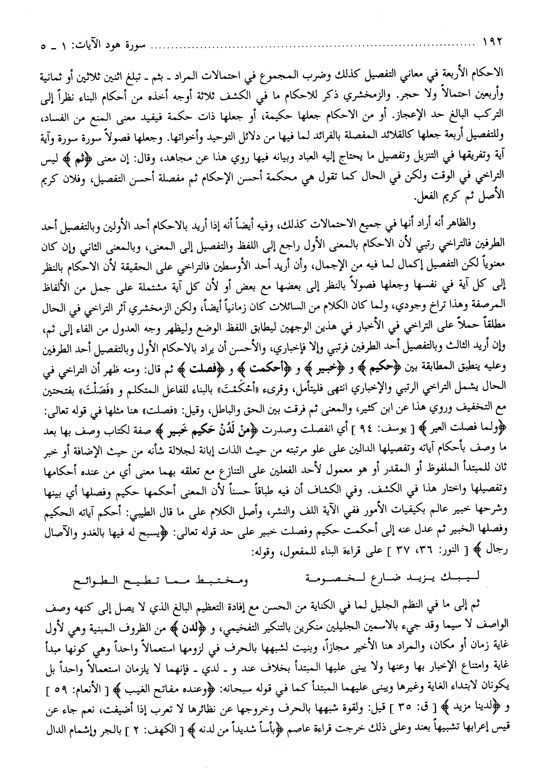 الاحكام الأربعة في معاني التفصيل كذلك وضرب المجموع في احتمالات المراد- بثم- تبلغ اثنين ثلاثين أو ثمانية وأربعين احتمالا ولا حجر. والزمخشري ذكر للاحكام ما في الكشف ثلاثة أوجه أخذه من أحكام البناء نظرا إلى التركب البالغ حد الإعجاز. أو من الاحكام جعلها حكيمة، أو جعلها ذات حكمة فيفيد معنى المنع من الفساد، وللتفصيل أربعة جعلها كالقلائد المفصلة بالفرائد لما فيها من دلائل التوحيد وأخواتها. وجعلها فصولا سورة سورة وآية آية وتفريقها في التنزيل وتفصيل ما يحتاج إليه العباد وبيانه فيها روي هذا عن مجاهد، وقال: إن معنى ثُمَّ ليس التراخي في الوقت ولكن في الحال كما تقول هي محكمة أحسن الإحكام ثم مفصلة أحسن التفصيل، وفلان كريم الأصل ثم كريم الفعل.