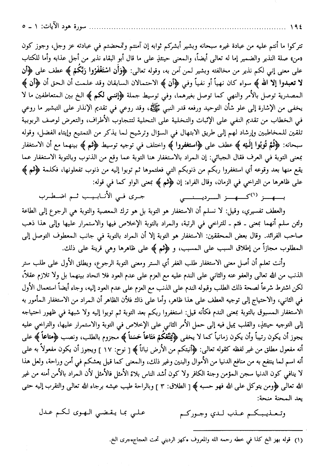 تتركوا ما أنتم عليه من عبادة غيره سبحانه وبشير أبشركم ثوابه إن آمنتم وتمحضتم في عبادته عز وجل، وجوز كون «من» صلة النذير والضمير إما له تعالى أيضا، والمعنى حينئذ على ما قال أبو البقاء نذير من أجل عذابه وأما للكتاب على معنى إني لكم نذير من مخالفته وبشير لمن آمن به، وقوله تعالى: وَأَنِ اسْتَغْفِرُوا رَبَّكُمْ عطف على أَنْ لا تَعْبُدُوا إِلَّا اللَّهَ سواء كان نهيا أو نفيا وفي أَنِ الاحتمالان السابقان وقد علمت أن الحق أن أَنِ المصدرية توصل بالأمر والنهي كما توصل بغيرهما، وفي توسيط جملة إِنَّنِي لَكُمْ إلخ بين المتعاطفين ما لا يخفى من الإشارة إلى علو شأن التوحيد ورفعه قدر النبي صلّى الله عليه وسلم، وقد روعي في تقديم الإنذار على التبشير ما روعي في الخطاب من تقديم النفي على الإثبات والتخلية على التحلية للتجاوب الأطراف، والتعرض لوصف الربوبية تلقين للمخاطبين وإرشاد لهم إلى طريق الابتهال في السؤال وترشيح لما يذكر من التمتيع وإيتاء الفضل، وقوله سبحانه: ثُمَّ تُوبُوا إِلَيْهِ عطف على اسْتَغْفِرُوا واختلف في توجيه توسيط ثُمَّ بينهما مع أن الاستغفار بمعنى التوبة في العرف فقال الجبائي: إن المراد بالاستغفار هنا التوبة عما وقع من الذنوب وبالتوبة الاستغفار عما يقع منها بعد وقوعه أي استغفروا ربكم من ذنوبكم التي فعلتموها ثم توبوا إليه من ذنوب تفعلونها، فكلمة ثُمَّ على ظاهرها من التراخي في الزمان، وقال الفراء: إن ثُمَّ بمعنى الواو كما في قوله:
