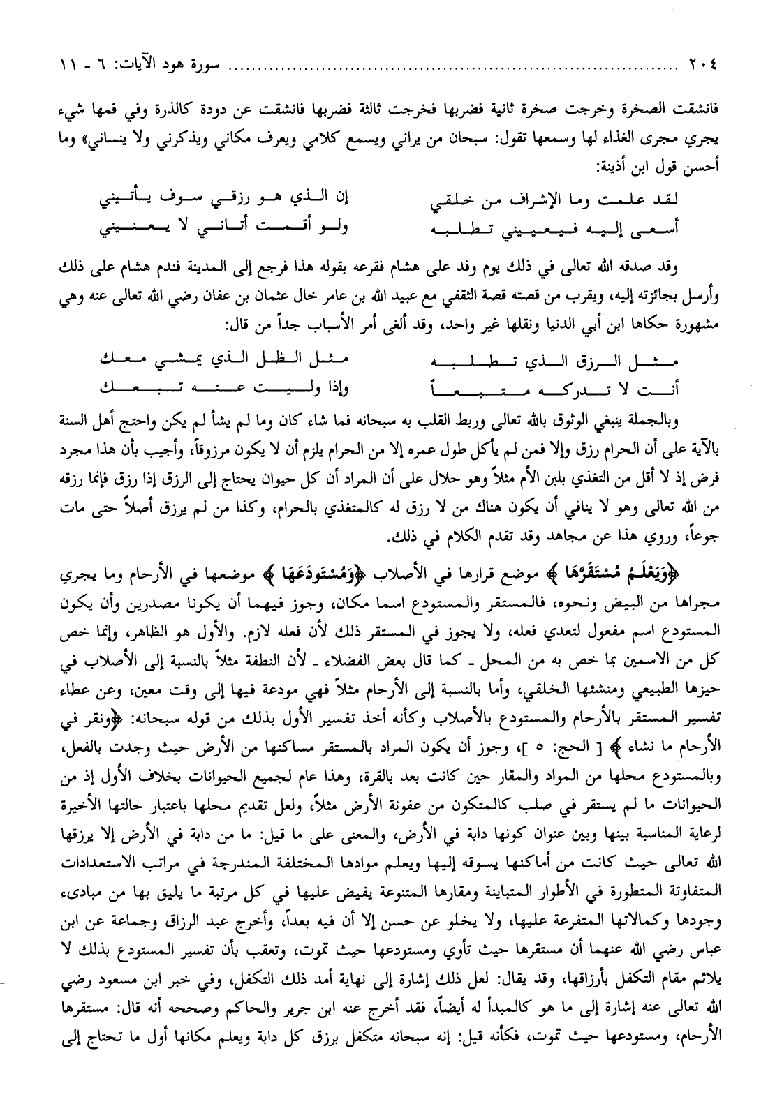وَيَعْلَمُ مُسْتَقَرَّها موضع قرارها في الأصلاب وَمُسْتَوْدَعَها موضعها في الأرحام وما يجري مجراها من البيض ونحوه، فالمستقر والمستودع اسما مكان، وجوز فيهما أن يكونا مصدرين وأن يكون المستودع اسم مفعول لتعدي فعله، ولا يجوز في المستقر ذلك لأن فعله لازم. والأول هو الظاهر، وإنما خص كل من الاسمين بما خص به من المحل- كما قال بعض الفضلاء- لأن النطفة مثلا بالنسبة إلى الأصلاب في حيزها الطبيعي ومنشئها الخلقي، وأما بالنسبة إلى الأرحام مثلا فهي مودعة فيها إلى وقت معين، وعن عطاء تفسير المستقر بالأرحام والمستودع بالأصلاب وكأنه أخذ تفسير الأول بذلك من قوله سبحانه: وَنُقِرُّ فِي الْأَرْحامِ ما نَشاءُ [الحج: 5] ، وجوز أن يكون المراد بالمستقر مساكنها من الأرض حيث وجدت بالفعل، وبالمستودع محلها من المواد والمقار حين كانت بعد بالقرة، وهذا عام لجميع الحيوانات بخلاف الأول إذ من الحيوانات ما لم يستقر في صلب كالمتكون من عفونة الأرض مثلا، ولعل تقديم محلها باعتبار حالتها الأخيرة لرعاية المناسبة بينها وبين عنوان كونها دابة في الأرض مثلا، والمعنى على ما قيل: ما من دابة في الأرض إلا يرزقها الله تعالى حيث كانت من أماكنها يسوقه إليها ويعلم موادها المختلفة المندرجة في مراتب الاستعدادات المتفاوتة المتطورة في الأطوار المتباينة ومقارها المتنوعة يفيض عليها في كل مرتبة ما يليق بها من مبادئ وجودها وكمالاتها المتفرعة عليها، ولا يخلو عن حسن إلا أن فيه بعدا، وأخرج عبد الرزاق وجماعة عن ابن عباس رضي الله عنهما أن مستقرها حيث تأوي ومستودعها حيث تموت، وتعقب بأن تفسير المستودع بذلك لا يلائم مقام التكفل بأرزاقها، وقد يقال: لعل ذلك إشارة إلى نهاية أمد ذلك التكفل، وفي خبر ابن مسعود رضي الله تعالى عنه إشارة إلى ما هو كالمبدأ له أيضا، فقد أخرج عنه ابن جرير والحاكم وصححه أنه قال: مستقرها الأرحام، ومستودعها حيث تموت، فكأنه قيل: إنه سبحانه متكفل برزق كل دابة ويعلم مكانها أول ما تحتاج إلى