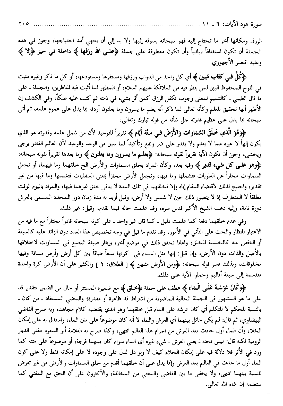 وَكانَ عَرْشُهُ عَلَى الْماءِ عطف على جملة خَلَقَ مع ضميره المستتر أو حال من الضمير بتقدير قد على ما هو المشهور في الجملة الحالية الماضوية من اشتراط قد ظاهرة أو مقدرة والمضي المستفاد- من كان- بالنسبة للحكم لا للتكلم أي كان عرشه على الماء قبل خلقهما وهو الذي يقتضيه كلام مجاهد، وبه صرح القاضي البيضاوي، ثم قال: لم يكن حائل بينهما أي العرش والماء لا أنه كان موضوعا على متن الماء، واستدل به على إمكان الخلاء وأن الماء أول حادث بعد العرش من اجرام هذا العالم انتهى، وكذا صرح به العلامة أبو السعود مفتي الديار الرومية لكنه قال: ليس تحته- يعني العرش- شيء غيره أي الماء سواء كان بينهما فرجة، أو موضوعا على متنه كما ورد في الأثر فلا دلالة فيه على إمكان الخلاء كيف لا ولو دل لدل على وجوده لا على إمكانه فقط ولا على كون الماء أول ما حدث في العالم بعد العرش وإنما يدل على أن خلقهما أقدم من خلق السماوات والأرض من غير تعرض للنسبة بينهما انتهى، ولا يخفى ما بين القاضي والمفتي من المخالفة، والأكثرون على أن الحق مع المفتي كما ستعلمه إن شاء الله تعالى.
