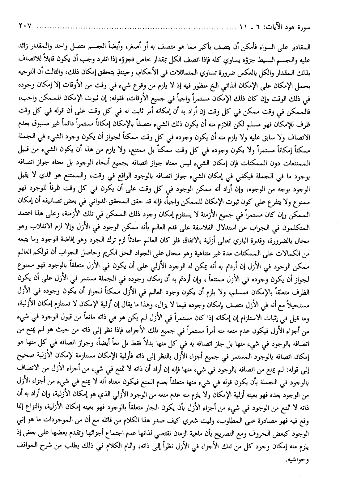 المقادير على السواء فأمكن أن يتصف بأكبر مما هو متصف به أو أصغر، وأيضا الجسم متصل واحد والمقدار زائد عليه والجسم البسيط جزؤه يساوي كله فإذا اتصف الكل بمقدار خاص فجزؤه إذا انفرد وجب أن يكون قابلا للاتصاف بذلك المقدار والكل بالعكس ضرورة تساوي المتماثلات في الأحكام، وحينئذ يتحقق إمكان ذلك، والثالث أن التوجيه بحمل الإمكان على الإمكان الذاتي إلخ منظور فيه إذ لا يلزم من وقوع شيء في وقت من الأوقات إلا إمكان وجوده في ذلك الوقت وإن كان ذلك الإمكان مستمرا واجبا في جميع الأوقات، فقوله: إن ثبوت الإمكان للممكن واجب، فالممكن في وقت ممكن في كل وقت إن أراد به أن إمكانه أمر ثابت له في كل وقت على أن قوله في كل وقت ظرف للإمكان فهو مسلم لكن اللازم منه أن يكون ذلك الشيء متصفا بالإمكان إمكانا مستمرا دائما غير مسبوق بعدم الاتصاف ولا سابق عليه ولا يلزم منه أن يكون وجوده في كل وقت ممكنا لجواز أن يكون وجود الشيء في الجملة ممكنا إمكانا مستمرا ولا يكون وجوده في كل وقت ممكنا بل ممتنع، ولا يلزم من هذا أن يكون الشيء من قبيل الممتنعات دون الممكنات فإن إمكان الشيء ليس معناه جواز اتصافه بجميع أنحاء الوجود بل معناه جواز اتصافه بوجود ما في الجملة فيكفي في إمكان الشيء جواز اتصافه بالوجود الواقع في وقت، والممتنع هو الذي لا يقبل الوجود بوجه من الوجوه، وإن أراد أنه ممكن الوجود في كل وقت على أن يكون في كل وقت ظرفا للوجود فهو ممنوع ولا يتفرع على كون ثبوت الإمكان للممكن واجبا، فإنه قد حقق المحقق الدواني في بعض تصانيفه أن إمكان الممكن وإن كان مستمرا في جميع الأزمنة لا يستلزم إمكان وجود ذلك الممكن في تلك الأزمنة، وعلى هذا اعتمد المتكلمون في الجواب عن استدلال الفلاسفة على قدم العالم بأنه ممكن الوجود في الأزل وإلا لزم الانقلاب وهو محال بالضرورة، وقدرة الباري تعالى أزلية بالاتفاق فلو كان العالم حادثا لزم ترك الجود وهو إفاضة الوجود وما يتبعه من الكمالات
