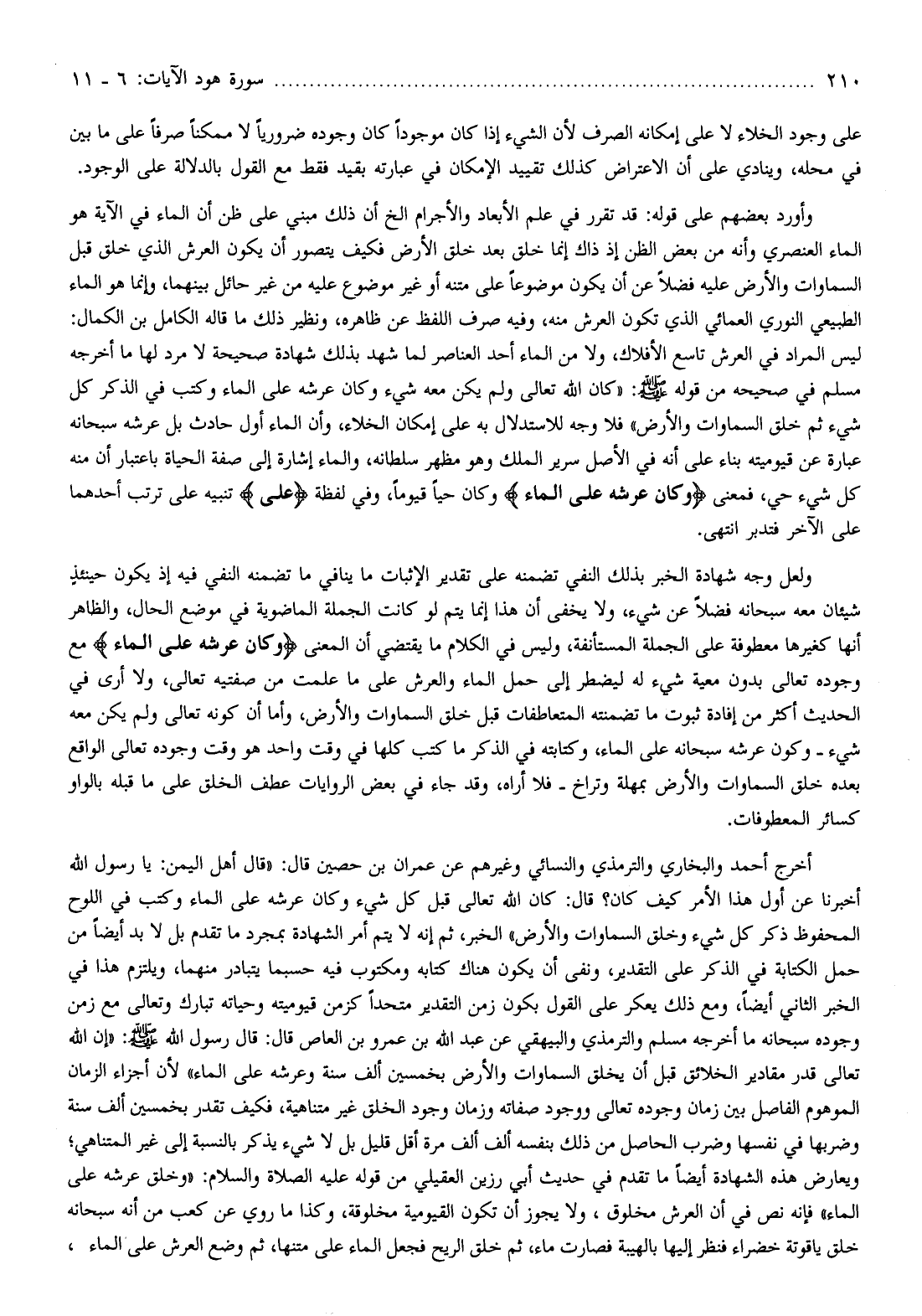ولعل وجه شهادة الخبر بذلك النفي تضمنه على تقدير الإثبات ما ينافي ما تضمنه النفي فيه إذ يكون حينئذ شيئان معه سبحانه فضلا عن شيء، ولا يخفى أن هذا إنما يتم لو كانت الجملة الماضوية في موضع الحال، والظاهر أنها كغيرها معطوفة على الجملة المستأنفة، وليس في الكلام ما يقتضي أن المعنى وَكانَ عَرْشُهُ عَلَى الْماءِ مع وجوده تعالى بدون معية شيء له ليضطر إلى حمل الماء والعرش على ما علمت من صفتيه تعالى، ولا أرى في الحديث أكثر من إفادة ثبوت ما تضمنته المتعاطفات قبل خلق السماوات والأرض، وأما أن كونه تعالى ولم يكن معه شيء- وكون عرشه سبحانه على الماء، وكتابته في الذكر ما كتب كلها في وقت واحد هو وقت وجوده تعالى الواقع بعده خلق السماوات والأرض بمهلة وتراخ- فلا أراه، وقد جاء في بعض الروايات عطف الخلق على ما قبله بالواو كسائر المعطوفات.