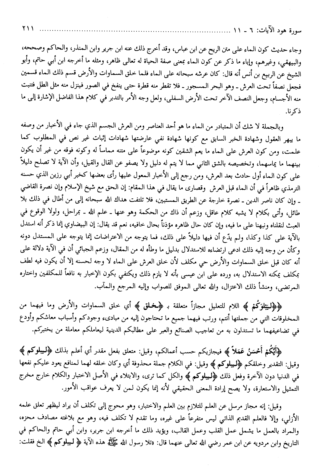 وبالجملة لا شك أن المتبادر من الماء ما هو أحد العناصر ومن العرش الجسم الذي جاء في الأخبار من وصفه ما يبهر العقول وشهادة الخبر السابق مع كونها شهادة نفي عارضتها شهادات إثبات غير نص في المطلوب كما علمت، ومن كون العرش على الماء ما يعم الشقين كونه موضوعا على متنه مماسا له وكونه فوقه من غير أن يكون بينهما ما يماسهما، وتخصيصه بالشق الثاني مما لا يتم له دليل ولا يصفو عن القال والقيل، وأن الآية لا تصلح دليلا على كون الماء أول حادث بعد العرش، ومن رجع إلى الأخبار المعول عليها رأى بعضها كخبر أبي رزين الذي حسنه الترمذي ظاهرا في أن الماء قبل العرش وقصارى ما يقال في هذا المقام: إن الحق مع شيخ الإسلام وإن نصرة القاضي- وإن كان ناصر الدين- نصرة خارجة عن الطريق المستبين، فلا تلتفت هداك الله سبحانه إلى من أطال في ذلك بلا طائل، وأتى بكلام لا يشبه كلام عاقل، وزعم أن ذاك من الحكمة وهو عنها- علم الله- بمراحل، ولولا الوقوع في العبث لنقلناه ونبهنا على ما فيه، وإن كان حال ظاهره مؤذنا بحال خافيه، نعم قد يقال: إن البيضاوي إنما ذكر أنه استدل بالآية على كذا وكذا، ولم يدّع أن فيها دليلا على ذلك، فما يتوجه من الاعتراضات إنما يتوجه على المستدل دونه وكأن من وجه إليه ذلك ادعى ارتضاءه للاستدلال بدليل ما وطأه له من المقال، وزعم الجبائي أن في الآية دلالة على أنه كان قبل خلق السماوات والأرض حي مكلف لأن خلق العرش على الماء لا وجه لحسنه إلا أن يكون فيه لطف بمكلف يمكنه الاستدلال به، ورده على ابن عيسى بأنه لا يلزم ذلك ويكتفي بكون الإخبار به نافعا للمكلفين واختاره المرتضى، ومنشأ ذلك الاعتزال، والله تعالى الموفق للصواب وإليه المرجع والمآب.