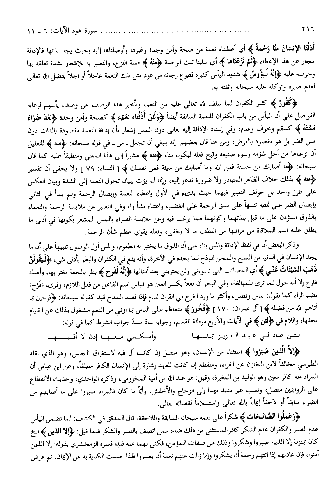 وَعَمِلُوا الصَّالِحاتِ شكرا على نعمه سبحانه السابقة واللاحقة، قال المدقق في الكشف: لما تضمن اليأس عدم الصبر والكفران عدم الشكر كان المستثنى من ذلك ضده ممن اتصف بالصبر والشكر فلما قيل: إِلَّا الَّذِينَ إلخ كان بمنزلة إلا الذين صبروا وشكروا وذلك من صفات المؤمن، فكنى بهما عنه فلذا فسره الزمخشري بقوله: إلا الذين آمنوا، فإن عادتهم إذا أتتهم رحمة أن يشكروا وإذا زالت عنهم نعمة أن يصبروا فلذا حسنت الكناية به عن الإيمان، ثم عرض