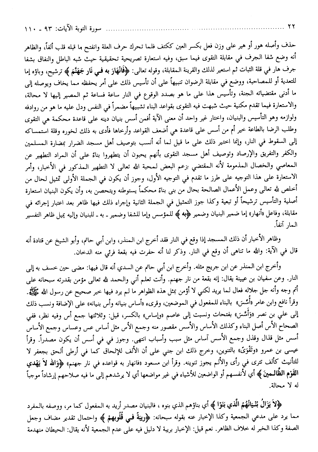 وقرأ نافع وابن عامر «أسّس» بالبناء للمفعول في الموضعين، وقرىء «أساس بنيانه وأس بنيانه» على الإضافة ونسب ذلك إلى علي بن نصر «وأسّس» بفتحات ونسبت إلى عاصم «وإساس» بالكسر، قيل: وثلاثتها جمع أس وفيه نظر، ففي الصحاح الأس أصل البناء وكذلك الأساس والأسس مقصور منه وجمع الأس مثل أساس عس وعساس وجمع الأساس أسس مثل قذال وقذل وجمع الأسس أساس مثل سبب وأسباب انتهى. وجوز في أسس أن يكون مصدرا. وقرأ عيسى بن عمرو «وتقوى» بالتنوين، وخرج ذلك ابن جني على أن الألف للإلحاق كما في أرطى ألحق بجعفر لا للتأنيث كألف تترى في رأى والألم يجوز تنوينه. وقرأ ابن مسعود «فانهار به قواعده في نار جهنم» وَاللَّهُ لا يَهْدِي الْقَوْمَ الظَّالِمِينَ أي لأنفسهم أو الواضعين للأشياء في غير مواضعها أي لا يرشدهم إلى ما فيه صلاحهم إرشادا موجبا له لا محالة.