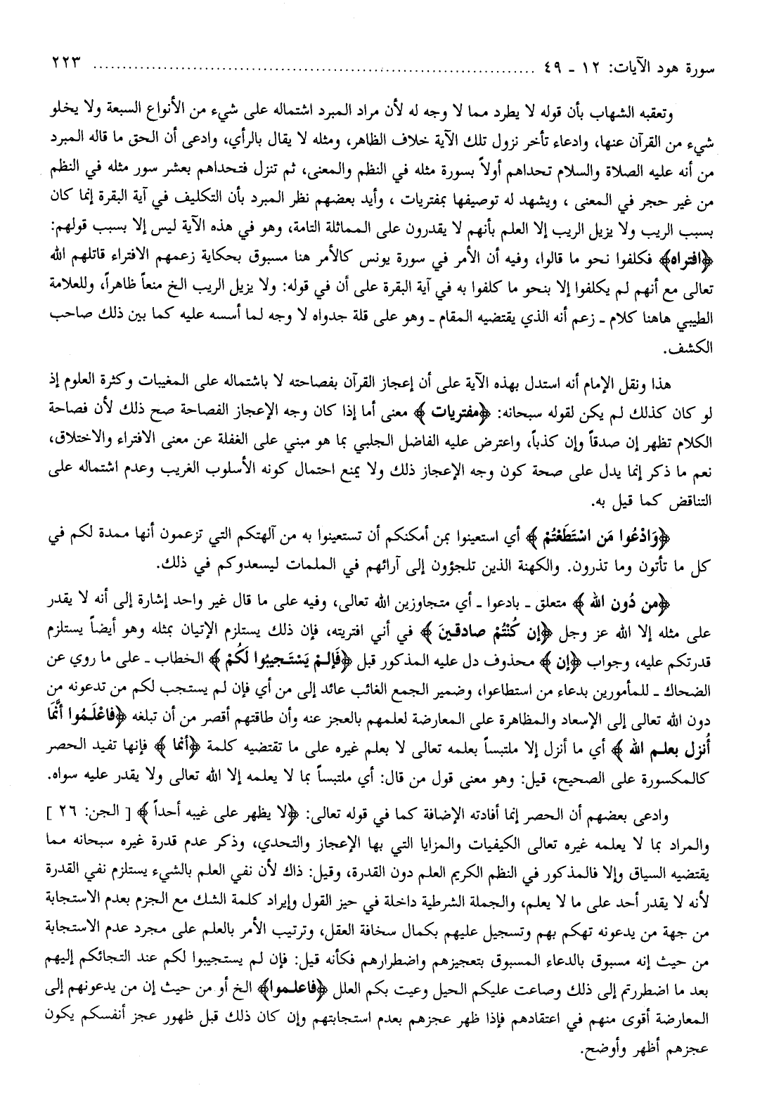 وتعقبه الشهاب بأن قوله لا يطرد مما لا وجه له لأن مراد المبرد اشتماله على شيء من الأنواع السبعة ولا يخلو شيء من القرآن عنها، وادعاء تأخر نزول تلك الآية خلاف الظاهر، ومثله لا يقال بالرأي، وادعى أن الحق ما قاله المبرد من أنه عليه الصلاة والسلام تحداهم أولا بسورة مثله في النظم والمعنى، ثم تنزل فتحداهم بعشر سور مثله في النظم من غير حجر في المعنى، ويشهد له توصيفها بمفتريات، وأيد بعضهم نظر المبرد بأن التكليف في آية البقرة إنما كان بسبب الريب ولا يزيل الريب إلا العلم بأنهم لا يقدرون على المماثلة التامة، وهو في هذه الآية ليس إلا بسبب قولهم: