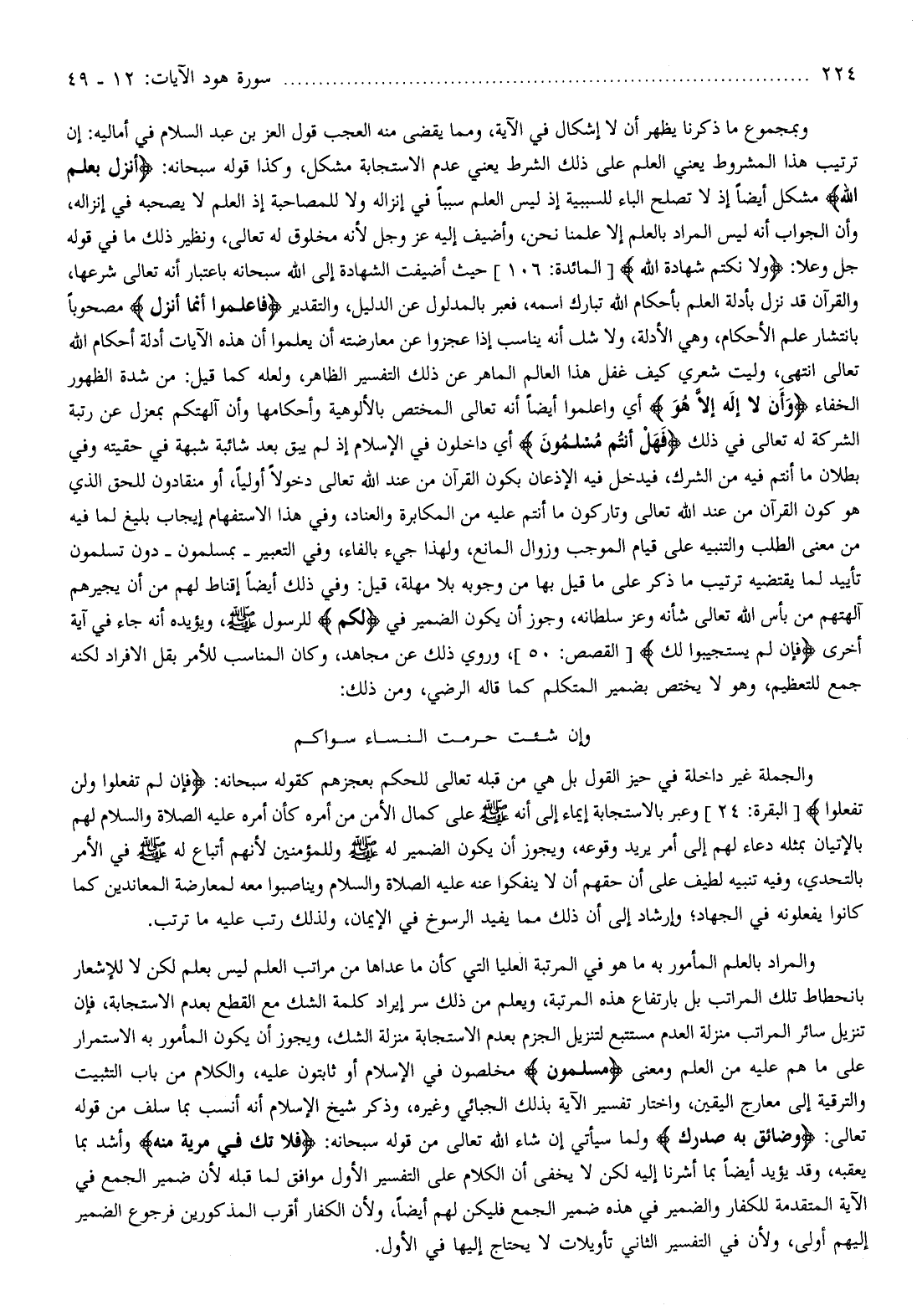 والمراد بالعلم المأمور به ما هو في المرتبة العليا التي كأن ما عداها من مراتب العلم ليس بعلم لكن لا للإشعار بانحطاط تلك المراتب بل بارتفاع هذه المرتبة، ويعلم من ذلك سر إيراد كلمة الشك مع القطع بعدم الاستجابة، فإن تنزيل سائر المراتب منزلة العدم مستتبع لتنزيل الجزم بعدم الاستجابة منزلة الشك، ويجوز أن يكون المأمور به الاستمرار على ما هم عليه من العلم ومعنى مُسْلِمُونَ مخلصون في الإسلام أو ثابتون عليه، والكلام من باب التثبيت والترقية إلى معارج اليقين، واختار تفسير الآية بذلك الجبائي وغيره، وذكر شيخ الإسلام أنه أنسب بما سلف من قوله تعالى: وَضائِقٌ بِهِ صَدْرُكَ ولما سيأتي إن شاء الله تعالى من قوله سبحانه: فَلا تَكُ فِي مِرْيَةٍ مِنْهُ وأشد بما يعقبه، وقد يؤيد أيضا بما أشرنا إليه لكن لا يخفى أن الكلام على التفسير الأول موافق لما قبله لأن ضمير الجمع في الآية المتقدمة للكفار والضمير في هذه ضمير الجمع فليكن لهم أيضا، ولأن الكفار أقرب المذكورين فرجوع الضمير إليهم أولى، ولأن في التفسير الثاني تأويلات لا يحتاج إليها في الأول.
