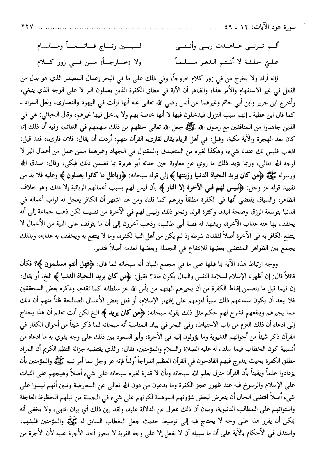 اذهب فليس لك عندنا شيء، وهكذا لغيره من المتصدق والمقتول في الجهاد وغيرهما ممن عمل من أعمال البر لا لوجه الله تعالى، وربما يؤيد ذلك ما روي عن معاوية حين حدثه أبو هريرة بما تضمن ذلك فبكى، وقال: صدق الله ورسوله صلّى الله عليه وسلّم مَنْ كانَ يُرِيدُ الْحَياةَ الدُّنْيا وَزِينَتَها إلى قوله سبحانه: وَباطِلٌ ما كانُوا يَعْمَلُونَ وعليه فلا بد من تقييد قوله عز وجل: لَيْسَ لَهُمْ فِي الْآخِرَةِ إِلَّا النَّارُ بأن ليس لهم بسبب أعمالهم الريائية إلا ذلك وهو خلاف الظاهر، والسياق يقتضي أنها في الكفرة مطلقا وبرهم كما قلنا، ومن هنا اشتهر أن الكافر يعجل له ثواب أعماله في الدنيا بتوسعة الرزق وصحة البدن وكثرة الولد ونحو ذلك وليس لهم في الآخرة من نصيب لكن ذهب جماعة إلى أنه يخفف بها عنه عذاب الآخرة، ويشهد له قصة أبي طالب، وذهب آخرون إلى أن ما يتوقف على النية من الأعمال لا ينتفع الكافر به في الآخرة أصلا لفقدان شرطه إذ لم يكن من أهل النية لكفره، وما لا ينتفع به ويخفف به عذابه، وبذلك يجمع بين الظواهر المقتضي بعضها للانتفاع في الجملة وبعضها لعدمه أصلا فتدبر.