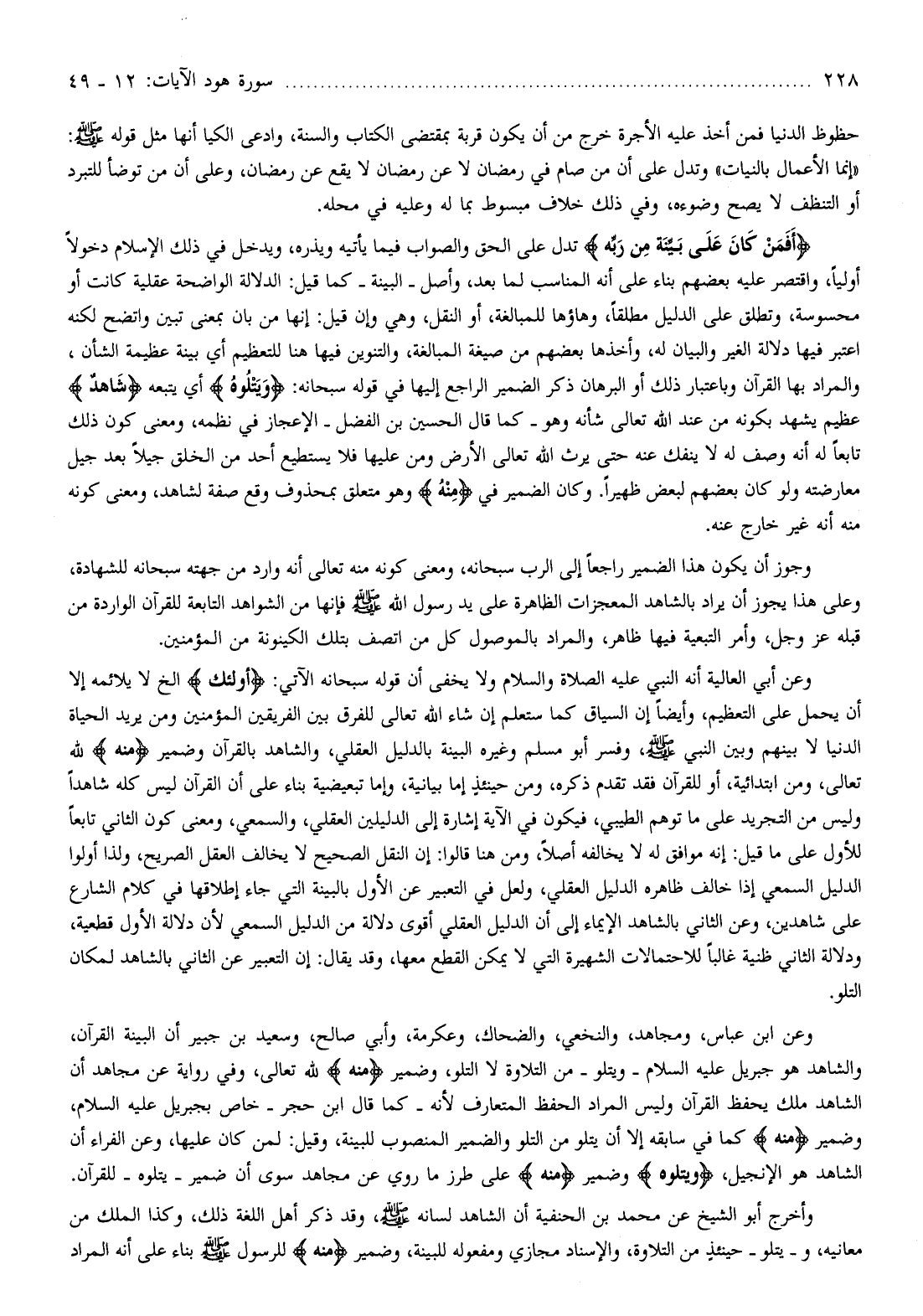 وعن أبي العالية أنه النبي عليه الصلاة والسلام ولا يخفى أن قوله سبحانه الآتي: أُولئِكَ إلخ لا يلائمه إلا أن يحمل على التعظيم، وأيضا إن السياق كما ستعلم إن شاء الله تعالى للفرق بين الفريقين المؤمنين ومن يريد الحياة الدنيا لا بينهم وبين النبي صلّى الله عليه وسلّم، وفسر أبو مسلم وغيره البينة بالدليل العقلي، والشاهد بالقرآن وضمير مِنْهُ لله تعالى، ومن ابتدائية، أو للقرآن فقد تقدم ذكره، ومن حينئذ إما بيانية، وإما تبعيضية بناء على أن القرآن ليس كله شاهدا وليس من التجريد على ما توهم الطيبي، فيكون في الآية إشارة إلى الدليلين العقلي، والسمعي، ومعنى كون الثاني تابعا للأول على ما قيل: إنه موافق له لا يخالفه أصلا، ومن هنا قالوا: إن النقل الصحيح لا يخالف العقل الصريح، ولذا أولوا الدليل السمعي إذا خالف ظاهره الدليل العقلي، ولعل في التعبير عن الأول بالبينة التي جاء إطلاقها في كلام الشارع على شاهدين، وعن الثاني بالشاهد الإيماء إلى أن الدليل العقلي أقوى دلالة من الدليل السمعي لأن دلالة الأول قطعية، ودلالة الثاني ظنية غالبا للاحتمالات الشهيرة التي لا يمكن القطع معها، وقد يقال: إن التعبير عن الثاني بالشاهد لمكان التلو.