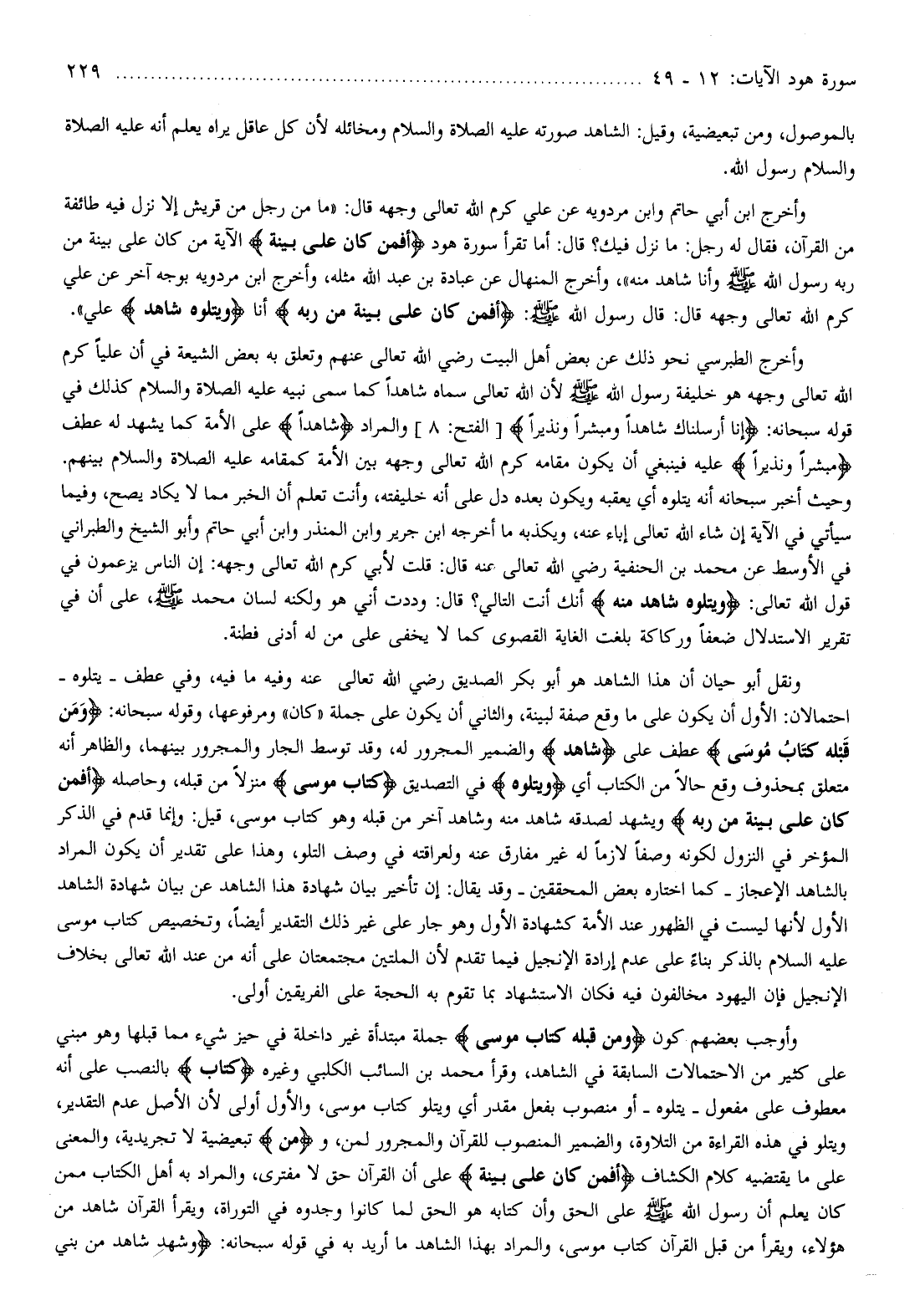 وأخرج ابن أبي حاتم وابن مردويه عن علي كرم الله تعالى وجهه قال: «ما من رجل من قريش إلا نزل فيه طائفة من القرآن، فقال له رجل: ما نزل فيك؟ قال: أما تقرأ سورة هود أَفَمَنْ كانَ عَلى بَيِّنَةٍ الآية من كان على بينة من ربه رسول الله صلّى الله عليه وسلّم وأنا شاهد منه» ، وأخرج المنهال عن عبادة بن عبد الله مثله،