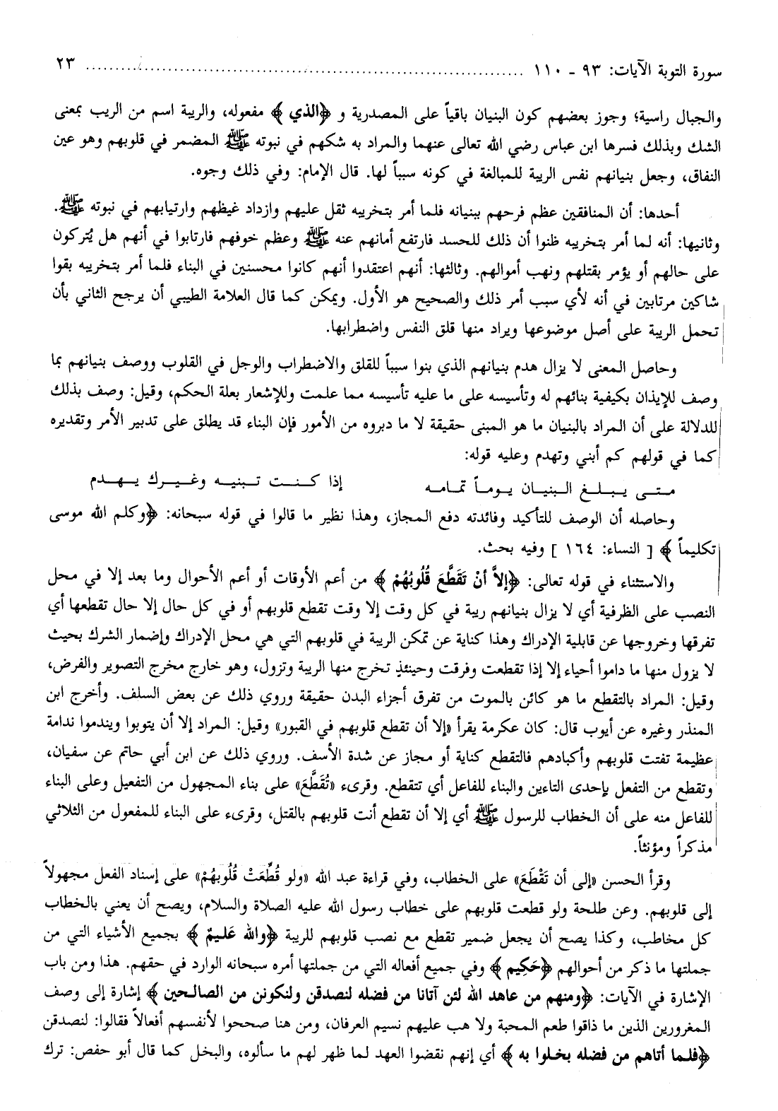 والاستثناء في قوله تعالى: إِلَّا أَنْ تَقَطَّعَ قُلُوبُهُمْ من أعم الأوقات أو أعم الأحوال وما بعد إلا في محل النصب على الظرفية أي لا يزال بنيانهم ريبة في كل وقت إلا وقت تقطع قلوبهم أو في كل حال إلا حال تقطعها أي تفرقها وخروجها عن قابلية الإدراك وهذا كناية عن تمكن الريبة في قلوبهم التي هي محل الإدراك وإضمار الشرك بحيث لا يزول منها ما داموا أحياء إلا إذا تقطعت وفرقت وحينئذ تخرج منها الريبة وتزول، وهو خارج مخرج التصوير والفرض، وقيل: المراد بالتقطع ما هو كائن بالموت من تفرق أجزاء البدن حقيقة وروي ذلك عن بعض السلف. وأخرج ابن المنذر وغيره عن أيوب قال: كان عكرمة يقرأ «إلا أن تقطع قلوبهم في القبور» وقيل: المراد إلا أن يتوبوا ويندموا ندامة عظيمة تفتت قلوبهم وأكبادهم فالتقطع كناية أو مجاز عن شدة الأسف. وروي ذلك عن ابن أبي حاتم عن سفيان، وتقطع من التفعل بإحدى التاءين والبناء للفاعل أي تتقطع. وقرىء «تقطّع» على بناء المجهول من التفعيل وعلى البناء للفاعل منه على أن الخطاب للرسول صلّى الله عليه وسلم أي إلا أن تقطع أنت قلوبهم بالقتل، وقرىء على البناء للمفعول من الثلاثي مذكرا ومؤنثا.