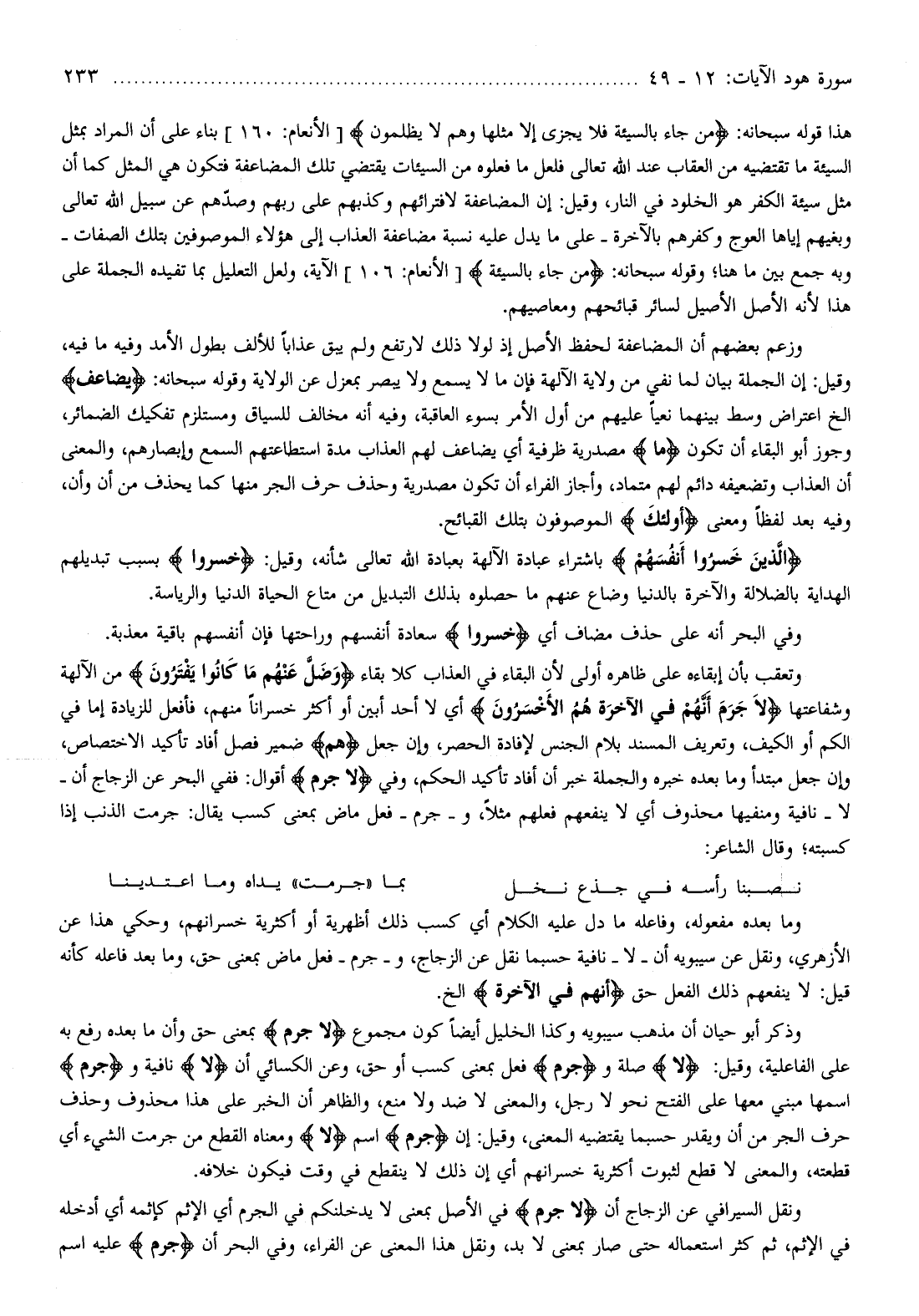 من الآلهة وشفاعتها لا جَرَمَ أَنَّهُمْ فِي الْآخِرَةِ هُمُ الْأَخْسَرُونَ أي لا أحد أبين أو أكثر خسرانا منهم، فأفعل للزيادة إما في الكم أو الكيف، وتعريف المسند بلام الجنس لإفادة الحصر، وإن جعل هُمُ ضمير فصل أفاد تأكيد الاختصاص، وإن جعل مبتدأ وما بعده خبره والجملة خبر أن أفاد تأكيد الحكم، وفي لا جَرَمَ أقوال: ففي البحر عن الزجاج أن- لا- نافية ومنفيها محذوف أي لا ينفعهم فعلهم مثلا، وجرم- فعل ماض بمعنى كسب يقال: جرمت الذنب إذا كسبته وقال الشاعر:
