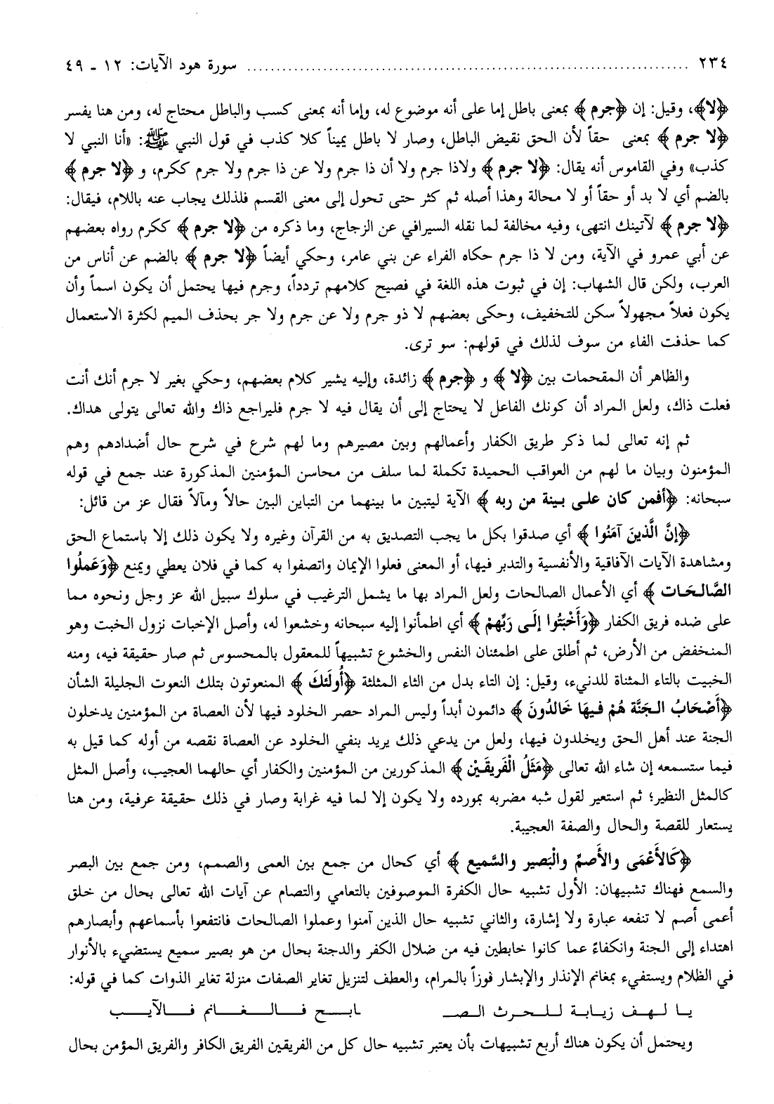 إِنَّ الَّذِينَ آمَنُوا أي صدقوا بكل ما يجب التصديق به من القرآن وغيره ولا يكون ذلك إلا باستماع الحق ومشاهدة الآيات الآفاقية والأنفسية والتدبر فيها، أو المعنى فعلوا الإيمان واتصفوا به كما في فلان يعطي ويمنع وَعَمِلُوا الصَّالِحاتِ أي الأعمال الصالحات ولعل المراد بها ما يشمل الترغيب في سلوك سبيل الله عز وجل ونحوه مما على ضده فريق الكفار وَأَخْبَتُوا إِلى رَبِّهِمْ أي اطمأنوا إليه سبحانه وخشعوا له، وأصل الإخبات نزول الخبت وهو المنخفض من الأرض، ثم أطلق على اطمئنان النفس والخشوع تشبيها للمعقول بالمحسوس ثم صار حقيقة فيه، ومنه الخبيت بالتاء المثناة للدنيء، وقيل: إن التاء بدل من الثاء المثلثة أُولئِكَ المنعوتون بتلك النعوت الجليلة الشأن أَصْحابُ الْجَنَّةِ هُمْ فِيها خالِدُونَ دائمون أبدا وليس المراد حصر الخلود فيها لأن العصاة من المؤمنين يدخلون الجنة عند أهل الحق ويخلدون فيها، ولعل من يدعي ذلك يريد بنفي الخلود عن العصاة نقصه من أوله كما قيل به فيما ستسمعه إن شاء الله تعالى مَثَلُ الْفَرِيقَيْنِ المذكورين من المؤمنين والكفار أي حالهما العجيب، وأصل المثل كالمثل النظير ثم استعير لقول شبه مضربه بمورده ولا يكون إلا لما فيه غرابة وصار في ذلك حقيقة عرفية، ومن هنا يستعار للقصة والحال والصفة العجيبة.