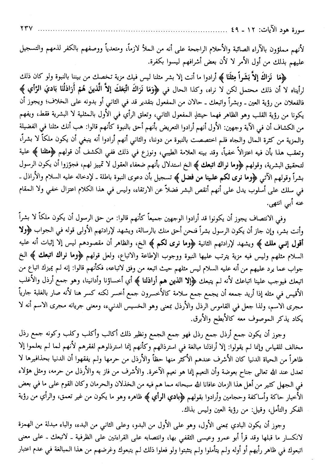 ما نَراكَ إِلَّا بَشَراً مِثْلَنا أرادوا ما أنت إلا بشر مثلنا ليس فيك مزية تخصك من بيننا بالنبوة ولو كان ذلك لرأيناه لا أن ذلك محتمل لكن لا نراه، وكذا الحال في وَما نَراكَ اتَّبَعَكَ إِلَّا الَّذِينَ هُمْ أَراذِلُنا بادِيَ الرَّأْيِ فالفعلان من رؤية العين- وبشرا واتبعك- حالان من المفعول بتقدير قد في الثاني أو بدونه على الخلاف ويجوز أن يكونا من رؤية القلب وهو الظاهر فهما حينئذ المفعول الثاني، وتعلق الرأي في الأول بالمثلية لا البشرية فقط، ويفهم من الكشاف أن في الآية وجهين: الأول أنهم أرادوا التعريض بأنهم أحق بالنبوة كأنهم قالوا: هب أنك مثلنا في الفضيلة والمزية من كثرة المال والجاه فلم اختصصت بالنبوة من دوننا، والثاني أنهم أرادوا أنه ينبغي أن يكون ملكا لا بشرا، وتعقب هذا بأن فيه اعتزالا خفيا، وقد بينه العلامة الطيبي، ونوزع في ذلك ففي الكشف أن قولهم مِثْلَنا علية لتحقيق البشرية، وقولهم وَما نَراكَ اتَّبَعَكَ إلخ استدلال بأنهم ضعفاء العقول لا تمييز لهم، فجوّزوا أن يكون الرسول بشرا وقولهم الآتي وَما نَرى لَكُمْ عَلَيْنا مِنْ فَضْلٍ تسجيل بأن دعوى النبوة باطلة- لإدخاله عليه السلام والأراذل- في سلك على أسلوب يدل على أنهم أنقص البشر فضلا عن الارتقاء، وليس في هذا الكلام اعتزال خفي ولا المقام عنه أبي انتهى.