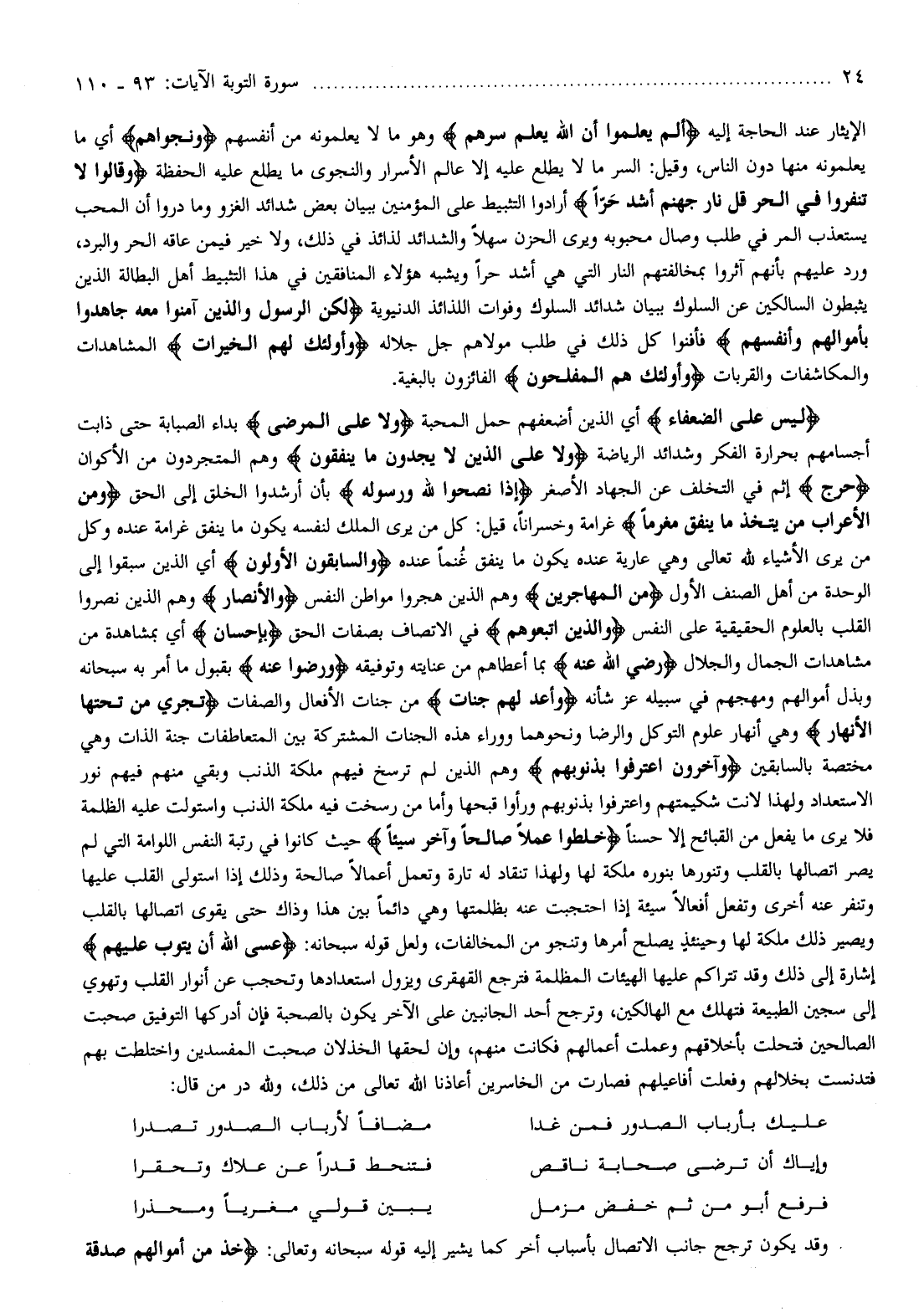 لَيْسَ عَلَى الضُّعَفاءِ أي الذين أضعفهم حمل المحبة وَلا عَلَى الْمَرْضى بداء الصبابة حتى ذابت أجسامهم بحرارة الفكر وشدائد الرياضة وَلا عَلَى الَّذِينَ لا يَجِدُونَ ما يُنْفِقُونَ وهم المتجردون من الأكوان حَرَجٌ إثم في التخلف عن الجهاد الأصغر إِذا نَصَحُوا لِلَّهِ وَرَسُولِهِ بأن أرشدوا الخلق إلى الحق وَمِنَ الْأَعْرابِ مَنْ يَتَّخِذُ ما يُنْفِقُ مَغْرَماً غرامة وخسرانا، قيل: كل من يرى الملك لنفسه يكون ما ينفق غرامة عنده وكل من يرى الأشياء لله تعالى وهي عارية عنده يكون ما ينفق غنما عنده وَالسَّابِقُونَ الْأَوَّلُونَ أي الذين سبقوا إلى الوحدة من أهل الصنف الأول مِنَ الْمُهاجِرِينَ وهم الذين هجروا مواطن النفس وَالْأَنْصارِ وهم الذين نصروا القلب بالعلوم الحقيقية على النفس وَالَّذِينَ اتَّبَعُوهُمْ في الاتصاف بصفات الحق بِإِحْسانٍ أي بمشاهدة من مشاهدات الجمال والجلال رَضِيَ اللَّهُ عَنْهُمْ بما أعطاهم من عنايته وتوفيقه وَرَضُوا عَنْهُ بقبول ما أمر به سبحانه وبذل أموالهم ومهجهم في سبيله عز شأنه وَأَعَدَّ لَهُمْ جَنَّاتٍ من جنات الأفعال والصفات تَجْرِي تَحْتَهَا الْأَنْهارُ وهي أنهار علوم التوكل والرضا ونحوهما ووراء هذه الجنات المشتركة بين المتعاطفات جنة الذات وهي مختصة بالسابقين وَآخَرُونَ اعْتَرَفُوا بِذُنُوبِهِمْ وهم الذين لم ترسخ فيهم ملكة الذنب وبقي منهم فيهم نور الاستعداد ولهذا لانت شكيمتهم واعترفوا بذنوبهم ورأوا قبحها وأما من رسخت فيه ملكة الذنب واستولت عليه الظلمة فلا يرى ما يفعل من القبائح إلا حسنا خَلَطُوا عَمَلًا صالِحاً وَآخَرَ سَيِّئاً حيث كانوا في رتبة النفس اللوامة التي لم يصر اتصالها بالقلب وتنورها بنوره ملكة لها ولهذا تنقاد له تارة وتعمل أعمالا صالحة وذلك إذا استولى القلب عليها وتنفر عنه أخرى وتفعل أفعالا سيئة إذا احتجبت عنه بظلمتها وهي دائما بين هذا وذاك حتى يقوى اتصالها بالقلب ويصير ذلك ملكة لها وحينئذ يصلح أمرها وتنجو من المخالفات، ولعل قوله سبحانه: عَسَى اللَّهُ أَنْ يَتُوبَ عَلَيْهِمْ إشارة إلى ذلك وقد تتراكم عليها الهيئات المظلمة فترجع القهقرى ويزول استعدادها وتحجب عن أنوار القلب وتهوي إلى سجين الطبيعة فتهلك مع الهالكين، وترجح أحد الجانبين على الآخر يكون بالصحبة فإن أدركها التوفيق صحبت الصالحين فتحلت بأخلاقهم وعملت أعمالهم فكانت منهم، وإن لحقها الخذلان صحبت المفسدين واختلطت بهم فتدنست بخلالهم وفعلت أفاعيلهم فصارت من الخاسرين أعاذنا الله تعالى من ذلك، ولله در من قال:
