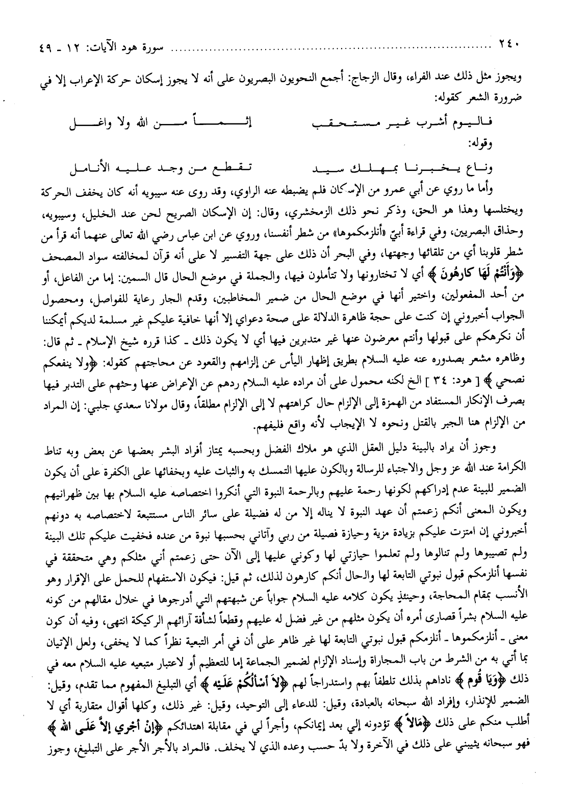 وأما ما روي عن أبي عمرو من الإسكان فلم يضبطه عنه الراوي، وقد روى عنه سيبويه أنه كان يخفف الحركة ويختلسها وهذا هو الحق، وذكر نحو ذلك الزمخشري، وقال: إن الإسكان الصريح لحن عند الخليل، وسيبويه، وحذاق البصريين، وفي قراءة أبيّ «أنلزمكموها» من شطر أنفسنا، وروي عن ابن عباس رضي الله تعالى عنهما أنه قرأ من شطر قلوبنا أي من تلقائها وجهتها، وفي البحر أن ذلك على جهة التفسير لا على أنه قرآن لمخالفته سواد المصحف وَأَنْتُمْ لَها كارِهُونَ أي لا تختارونها ولا تتأملون فيها، والجملة في موضع الحال قال السمين: إما من الفاعل، أو من أحد المفعولين، واختير أنها في موضع الحال من ضمير المخاطبين، وقدم الجار رعاية للفواصل، ومحصول الجواب أخبروني إن كنت على حجة ظاهرة الدلالة على صحة دعواي إلا أنها خافية عليكم غير مسلمة لديكم أيمكننا أن نكرهكم على قبولها وأنتم معرضون عنها غير متدبرين فيها أي لا يكون ذلك- كذا قرره شيخ الإسلام- ثم قال:
