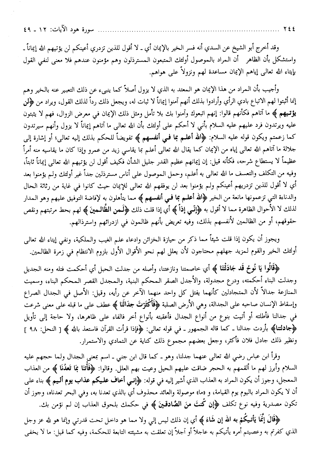 قالُوا يا نُوحُ قَدْ جادَلْتَنا أي خاصمتنا ونازعتنا، وأصله من جدلت الحبل أي أحكمت فتله ومنه الجديل وجدلت البناء أحكمته، ودرع مجدولة، والأجدل الصقر المحكم البنية، والمجدل القصر المحكم البناء، وسميت المنازعة جدالا لأن المتجادلين كأنهما يفتل كل واحد منهما الآخر عن رأيه، وقيل: الأصل في الجدال الصراع وإسقاط الإنسان صاحبه على الجدالة، وهي الأرض الصلبة فَأَكْثَرْتَ جِدالَنا عطف على ما قبله على معنى شرعت في جدالنا فأطلته أو أتيت بنوع من أنواع الجدال فأعقبته بأنواع أخر فالفاء على ظاهرها، ولا حاجة إلى تأويل جادَلْتَنا بأردت جدالنا- كما قاله الجمهور- في قوله تعالى: فَإِذا قَرَأْتَ الْقُرْآنَ فَاسْتَعِذْ بِاللَّهِ [النحل: 98] ونظير ذلك جادل فلان فأكثر، وجعل بعضهم مجموع ذلك كناية عن التمادي والاستمرار.