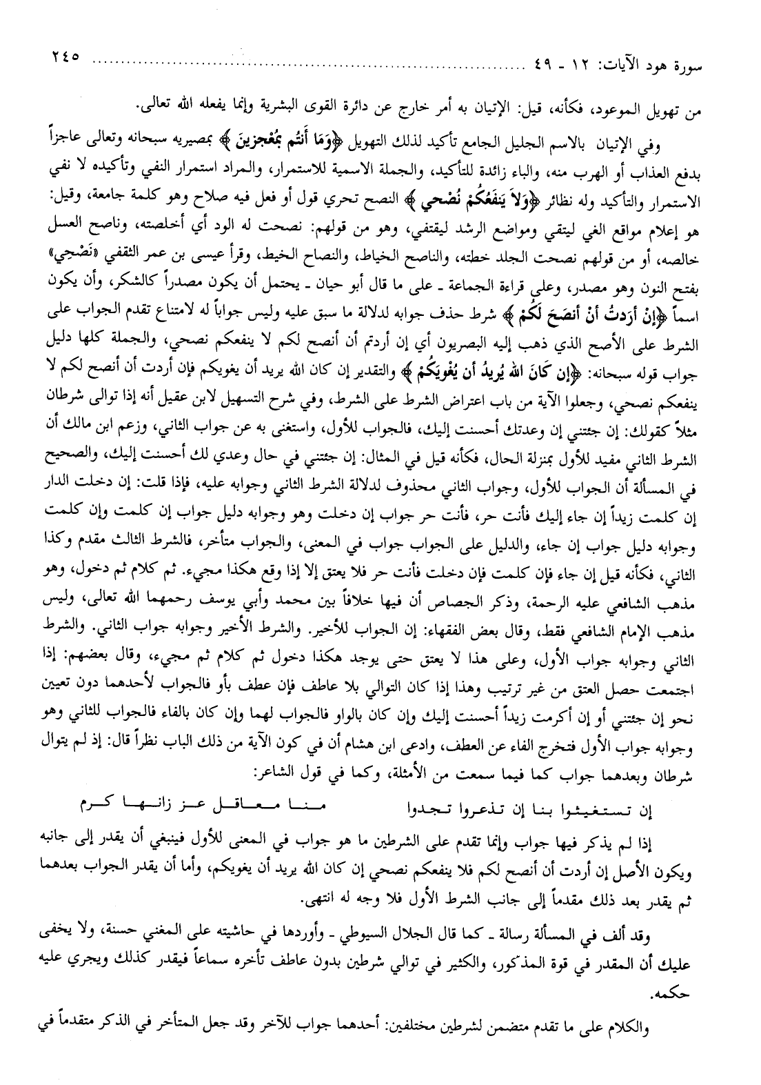 هو إعلام مواقع الغي ليتقي ومواضع الرشد ليقتفي، وهو من قولهم: نصحت له الود أي أخلصته، وناصح العسل خالصه، أو من قولهم نصحت الجلد خطته، والناصح الخياط، والنصاح الخيط، وقرأ عيسى بن عمر الثقفي «نصحي» بفتح النون وهو مصدر، وعلى قراءة الجماعة- على ما قال أبو حيان- يحتمل أن يكون مصدرا كالشكر، وأن يكون اسما إِنْ أَرَدْتُ أَنْ أَنْصَحَ لَكُمْ شرط حذف جوابه لدلالة ما سبق عليه وليس جوابا له لامتناع تقدم الجواب على الشرط على الأصح الذي ذهب إليه البصريون أي إن أردتم أن أنصح لكم لا ينفعكم نصحي، والجملة كلها دليل جواب قوله سبحانه: إِنْ كانَ اللَّهُ يُرِيدُ أَنْ يُغْوِيَكُمْ والتقدير إن كان الله يريد أن يغويكم فإن أردت أن أنصح لكم لا ينفعكم نصحي، وجعلوا الآية من باب اعتراض الشرط على الشرط، وفي شرح التسهيل لابن عقيل أنه إذا توالى شرطان مثلا كقولك: إن جئتني إن وعدتك أحسنت إليك، فالجواب للأول، واستغنى به عن جواب الثاني، وزعم ابن مالك أن الشرط الثاني مفيد للأول بمنزلة الحال، فكأنه قيل في المثال: إن جئتني في حال وعدي لك أحسنت إليك، والصحيح في المسألة أن الجواب للأول، وجواب الثاني محذوف لدلالة الشرط الثاني وجوابه عليه، فإذا قلت: إن دخلت الدار إن كلمت زيدا إن جاء إليك فأنت حر، فأنت حر جواب إن دخلت وهو وجوابه دليل جواب إن كلمت وإن كلمت وجوابه دليل جواب إن جاء، والدليل على الجواب جواب في المعنى، والجواب متأخر، فالشرط الثالث مقدم وكذا الثاني، فكأنه قيل إن جاء فإن كلمت فإن دخلت فأنت حر فلا يعتق إلا إذا وقع هكذا مجيء. ثم كلام ثم دخول، وهو مذهب الشافعي عليه الرحمة، وذكر الجصاص أن فيها خلافا بين محمد وأبي يوسف رحمهما الله تعالى، وليس مذهب الإمام الشافعي فقط، وقال بعض الفقهاء: إن الجواب للأخير. والشرط الأخير وجوابه جواب الثاني. والشرط الثاني وجوابه جواب الأول، وعلى هذا لا يعتق حتى يوجد هكذا دخول ثم كلام ثم مجيء، وقال بعضهم: إذا اجتمعت حصل العتق من غير ترتيب وهذا إذا كان التوالي بلا عاطف فإن عطف بأو فالجواب لأحدهما دون تعيين نحو إن جئتني أو إن أكرمت زيدا أحسنت إليك وإن كان بالواو فالجواب لهما وإن كان بالفاء فالجواب للثاني وهو وجوابه جواب الأول فتخرج الفاء عن العطف، وادعى ابن هشام أن في كون الآية من ذلك الباب نظرا قال: إذ لم يتوال شرطان وبعدهما جواب كما فيما سمعت من الأمثلة، وكما في قول الشاعر: