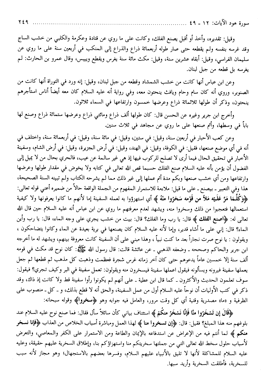 أخرجه ابن جرير والحاكم وصححه- وضعفه الذهبي- عن عائشة قالت: قال رسول الله صلّى الله عليه وسلّم: كان نوح قد مكث في قومه ألف سنة إلا خمسين عاما يدعوهم حتى كان آخر زمانه غرس شجرة فعظمت وذهبت كل مذهب ثم قطعها ثم جعل يعملها سفينة فيرونه ويسألونه فيقول أعملها سفينة فيسخرون منه ويقولون: تعمل سفينة في البر وكيف تجري؟ فيقول:
