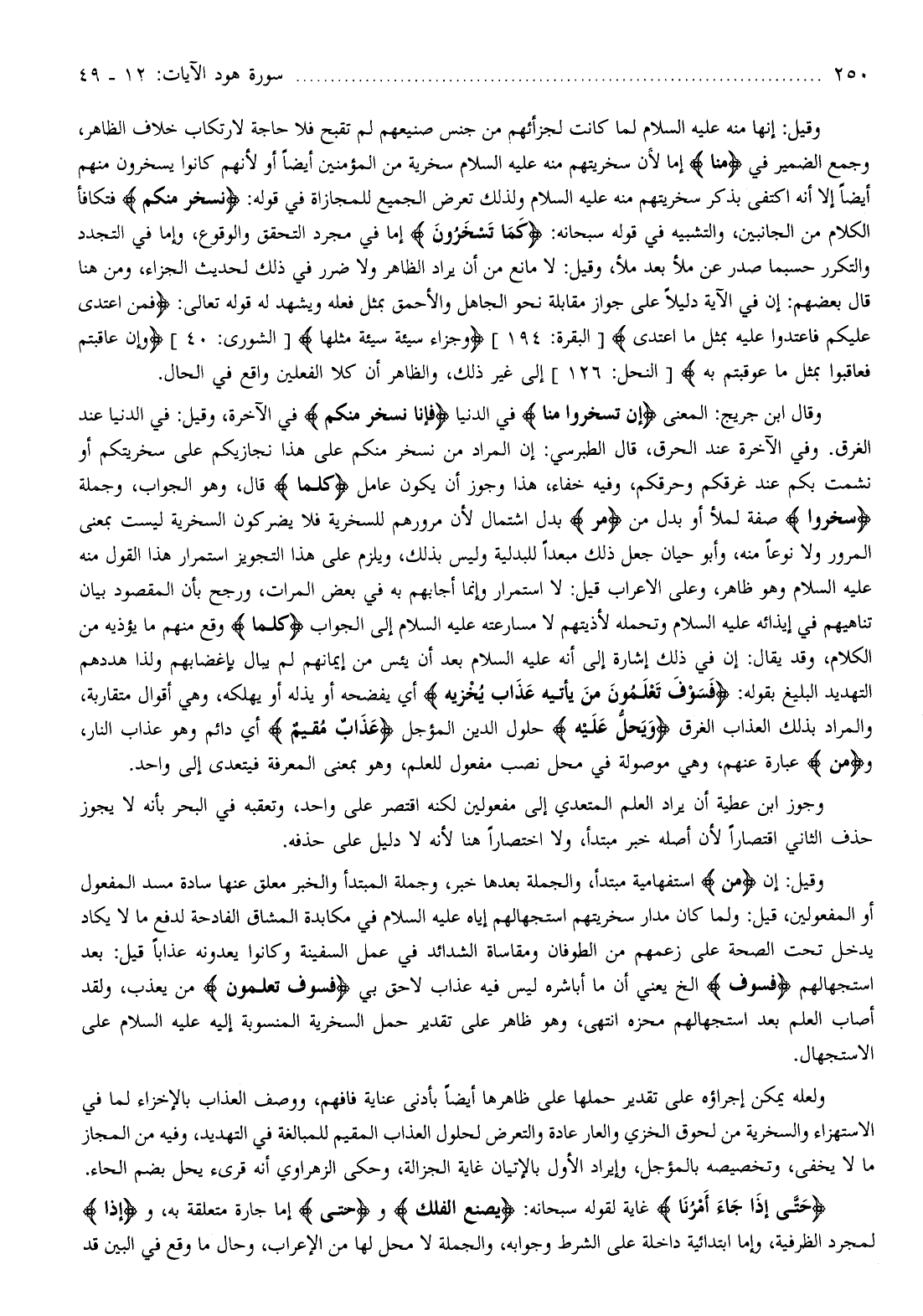 وقال ابن جريج: المعنى إِنْ تَسْخَرُوا مِنَّا في الدنيا فَإِنَّا نَسْخَرُ مِنْكُمْ في الآخرة، وقيل: في الدنيا عند الغرق. وفي الآخرة عند الحرق، قال الطبرسي: إن المراد من نسخر منكم على هذا نجازيكم على سخريتكم أو نشمت بكم عند غرقكم وحرقكم، وفيه خفاء، هذا وجوز أن يكون عامل كُلَّما قال، وهو الجواب، وجملة سَخِرُوا صفة لملأ أو بدل من مَرَّ بدل اشتمال لأن مرورهم للسخرية فلا يضركون السخرية ليست بمعنى المرور ولا نوعا منه، وأبو حيان جعل ذلك مبعدا للبدلية وليس بذلك، ويلزم على هذا التجويز استمرار هذا القول منه عليه السلام وهو ظاهر، وعلى الاعراب قيل: لا استمرار وإنما أجابهم به في بعض المرات، ورجح بأن المقصود بيان تناهيهم في إيذائه عليه السلام وتحمله لأذيتهم لا مسارعته عليه السلام إلى الجواب كُلَّما وقع منهم ما يؤذيه من الكلام، وقد يقال: إن في ذلك إشارة إلى أنه عليه السلام بعد أن يئس من إيمانهم لم يبال بإغضابهم ولذا هددهم التهديد البليغ بقوله: فَسَوْفَ تَعْلَمُونَ مَنْ يَأْتِيهِ عَذابٌ يُخْزِيهِ أي يفضحه أو يذله أو يهلكه، وهي أقوال متقاربة، والمراد بذلك العذاب الغرق وَيَحِلُّ عَلَيْهِ حلول الدين المؤجل عَذابٌ مُقِيمٌ أي دائم وهو عذاب النار، ومَنْ عبارة عنهم، وهي موصولة في محل نصب مفعول للعلم، وهو بمعنى المعرفة فيتعدى إلى واحد.