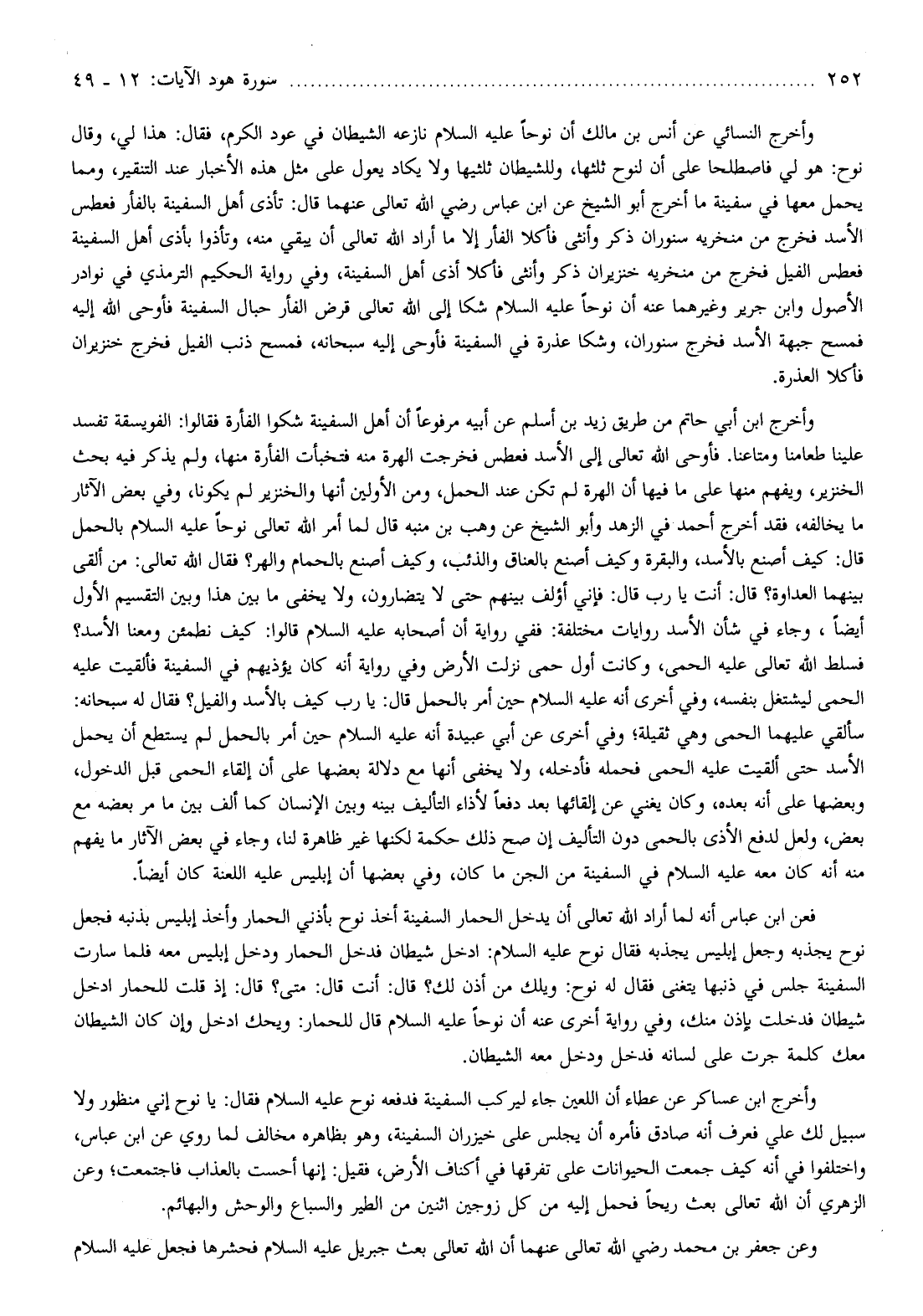 فعن ابن عباس أنه لما أراد الله تعالى أن يدخل الحمار السفينة أخذ نوح بأذني الحمار وأخذ إبليس بذنبه فجعل نوح يجذبه وجعل إبليس يجذبه فقال نوح عليه السلام: ادخل شيطان فدخل الحمار ودخل إبليس معه فلما سارت السفينة جلس في ذنبها يتغنى فقال له نوح: ويلك من أذن لك؟ قال: أنت قال: متى؟ قال: إذ قلت للحمار ادخل شيطان فدخلت بإذن منك، وفي رواية أخرى عنه أن نوحا عليه السلام قال للحمار: ويحك ادخل وإن كان الشيطان معك كلمة جرت على لسانه فدخل ودخل معه الشيطان.