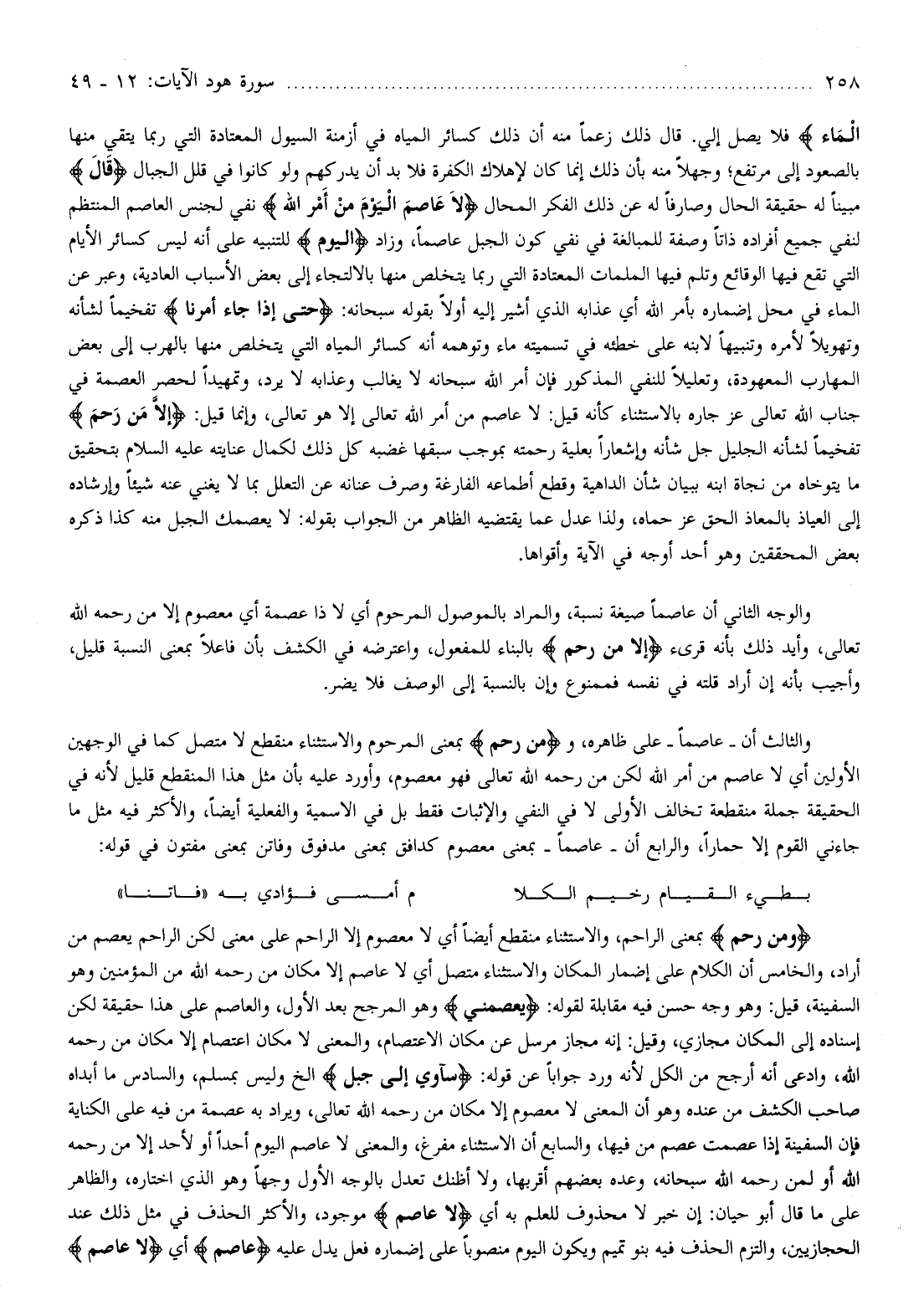 ومَنْ رَحِمَ بمعنى الراحم، والاستثناء منقطع أيضا أي لا معصوم إلا الراحم على معنى لكن الراحم يعصم من أراد، والخامس أن الكلام على إضمار المكان والاستثناء متصل أي لا عاصم إلا مكان من رحمه الله من المؤمنين وهو السفينة، قيل: وهو وجه حسن فيه مقابلة لقوله: يَعْصِمُنِي وهو المرجح بعد الأول، والعاصم على هذا حقيقة لكن إسناده إلى المكان مجازي، وقيل: إنه مجاز مرسل عن مكان الاعتصام، والمعنى لا مكان اعتصام إلا مكان من رحمه الله، وادعى أنه أرجح من الكل لأنه ورد جوابا عن قوله: سَآوِي إِلى جَبَلٍ إلخ وليس بمسلم، والسادس ما أبداه صاحب الكشف من عنده وهو أن المعنى لا معصوم إلا مكان من رحمه الله تعالى، ويراد به عصمة من فيه على الكناية فإن السفينة إذا عصمت عصم من فيها، والسابع أن الاستثناء مفرغ، والمعنى لا عاصم اليوم أحدا أو لأحد إلا من رحمه الله أو لمن رحمه الله سبحانه، وعده بعضهم أقربها، ولا أظنك تعدل بالوجه الأول وجها وهو الذي اختاره، والظاهر على ما قال أبو حيان: إن خبر لا محذوف للعلم به أي لا عاصِمَ موجود، والأكثر الحذف في مثل ذلك عند الحجازيين، والتزم الحذف فيه بنو تميم ويكون اليوم منصوبا على إضماره فعل يدل عليه عاصِمَ أي لا عاصِمَ
