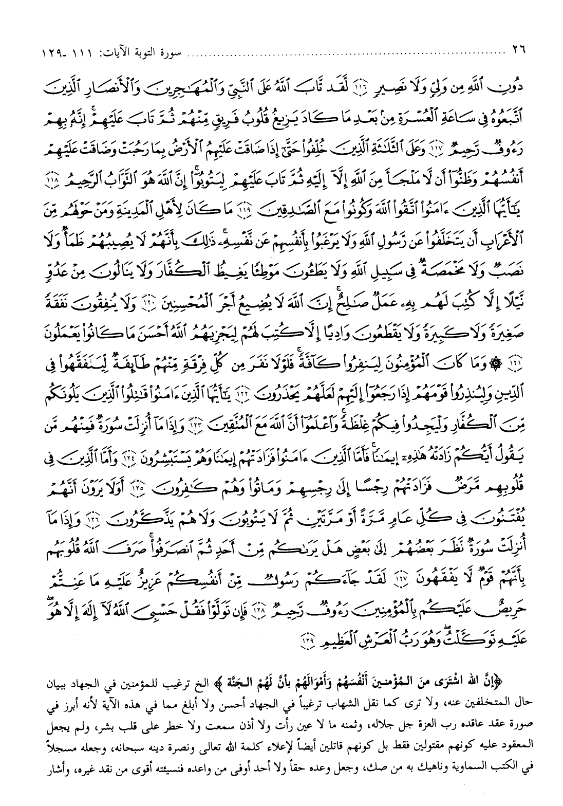 إِنَّ اللَّهَ اشْتَرى مِنَ الْمُؤْمِنِينَ أَنْفُسَهُمْ وَأَمْوالَهُمْ بِأَنَّ لَهُمُ الْجَنَّةَ إلخ ترغيب للمؤمنين في الجهاد ببيان حال المتخلفين عنه، ولا ترى كما نقل الشهاب ترغيبا في الجهاد أحسن ولا أبلغ مما في هذه الآية لأنه أبرز في صورة عقد عاقده رب العزة جل جلاله، وثمنه ما لا عين رأت ولا أذن سمعت ولا خطر على قلب بشر، ولم يجعل المعقود عليه كونهم مقتولين فقط بل كونهم قاتلين أيضا لإعلاء كلمة الله تعالى ونصرة دينه سبحانه، وجعله مسجلا في الكتب السماوية وناهيك به من صك، وجعل وعده حقا ولا أحد أوفى من واعده فنسيئته أقوى من نقد غيره، وأشار