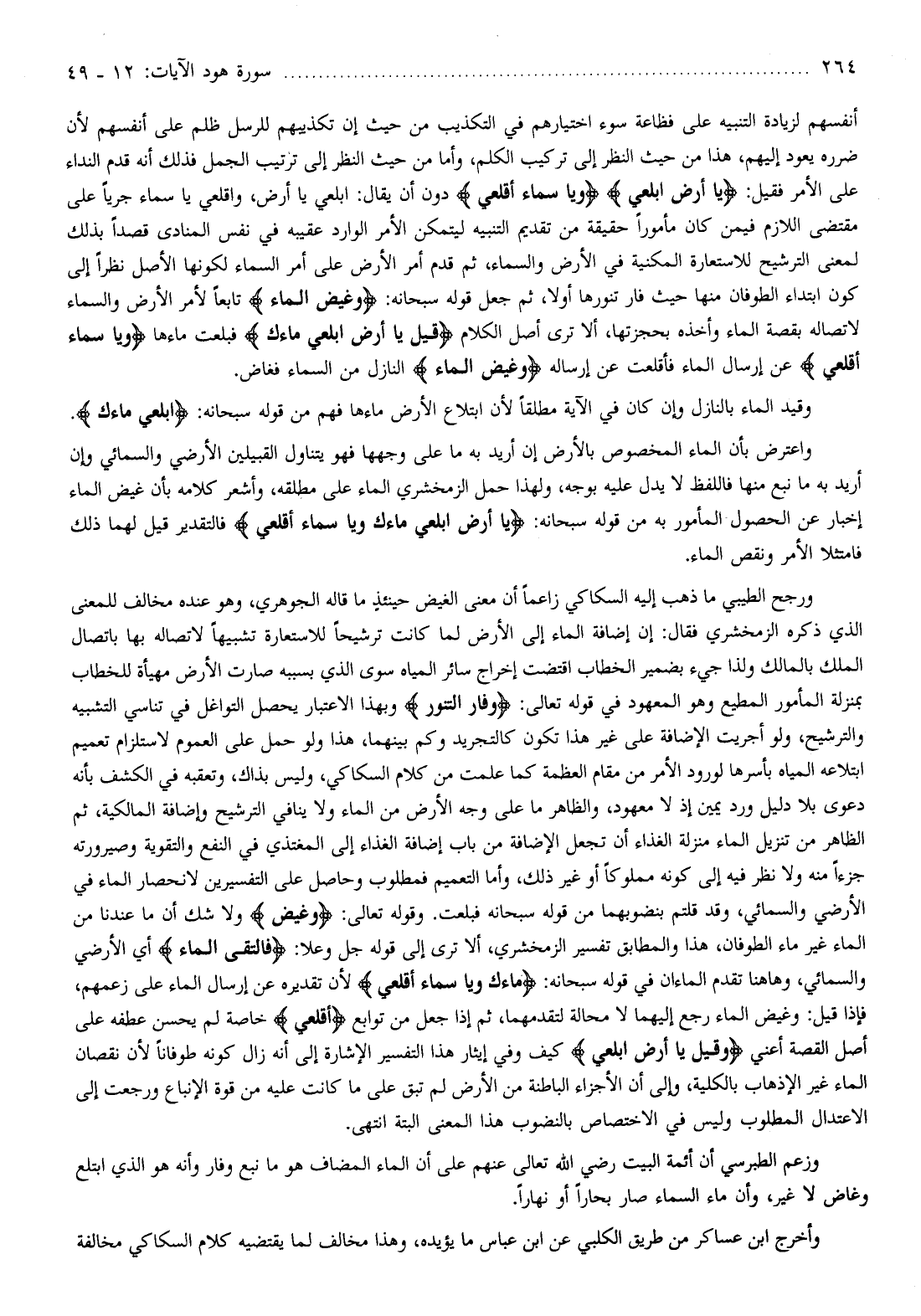 ورجح الطيبي ما ذهب إليه السكاكي زاعما أن معنى الغيض حينئذ ما قاله الجوهري، وهو عنده مخالف للمعنى الذي ذكره الزمخشري فقال: إن إضافة الماء إلى الأرض لما كانت ترشيحا للاستعارة تشبيها لاتصاله بها باتصال الملك بالمالك ولذا جيء بضمير الخطاب اقتضت إخراج سائر المياه سوى الذي بسببه صارت الأرض مهيأة للخطاب بمنزلة المأمور المطيع وهو المعهود في قوله تعالى: وَفارَ التَّنُّورُ وبهذا الاعتبار يحصل التواغل في تناسي التشبيه والترشيح، ولو أجريت الإضافة على غير هذا تكون كالتجريد وكم بينهما، هذا ولو حمل على العموم لاستلزام تعميم ابتلاعه المياه بأسرها لورود الأمر من مقام العظمة كما علمت من كلام السكاكي، وليس بذاك، وتعقبه في الكشف بأنه دعوى بلا دليل ورد يمين إذ لا معهود، والظاهر ما على وجه الأرض من الماء ولا ينافي الترشيح وإضافة المالكية، ثم الظاهر من تنزيل الماء منزلة الغذاء أن تجعل الإضافة من باب إضافة الغذاء إلى المغتذي في النفع والتقوية وصيرورته جزءا منه ولا نظر فيه إلى كونه مملوكا أو غير ذلك، وأما التعميم فمطلوب وحاصل على التفسيرين لانحصار الماء في الأرضي والسمائي، وقد قلتم بنضوبهما من قوله سبحانه فبلعت. وقوله تعالى: وَغِيضَ ولا شك أن ما عندنا من الماء غير ماء الطوفان، هذا والمطابق تفسير الزمخشري، ألا ترى إلى قوله جل وعلا: فَالْتَقَى الْماءُ أي الأرضي والسمائي، وهاهنا تقدم الماءان في قوله سبحانه: ماءَكِ وَيا سَماءُ أَقْلِعِي لأن تقديره عن إرسال الماء على زعمهم، فإذا قيل: وغيض الماء رجع إليهما لا محالة لتقدمهما، ثم إذا جعل من توابع أَقْلِعِي خاصة لم يحسن عطفه على أصل القصة أعني وَقِيلَ يا أَرْضُ ابْلَعِي كيف وفي إيثار هذا التفسير الإشارة إلى أنه زال كونه طوفانا لأن نقصان الماء غير الإذهاب بالكلية، وإلى أن الأجزاء الباطنة من الأرض لم تبق على ما كانت عليه من قوة الإنباع ورجعت إلى الاعتدال المطلوب وليس في الاختصاص بالنضوب هذا المعنى البتة انتهى.