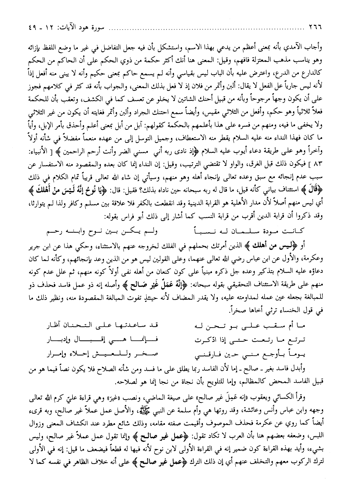 83] فيكون ذلك قبل الغرق، والواو لا تقتضي الترتيب، وقيل: إن النداء إنما كان بعده والمقصود منه الاستفسار عن سبب عدم إنجائه مع سبق وعده تعالى بإنجاء أهله وهو منهم، وسيأتي إن شاء الله تعالى قريبا تمام الكلام في ذلك قالَ استئناف بياني كأنه قيل، ما قال له ربه سبحانه حين ناداه بذلك؟ فقيل: قال: يا نُوحُ إِنَّهُ لَيْسَ مِنْ أَهْلِكَ أي ليس منهم أصلا لأن مدار الأهلية هو القرابة الدينية وقد انقطعت بالكفر فلا علاقة بين مسلم وكافر ولذا لم يتوارثا، وقد ذكروا أن قرابة الدين أقرب من قرابة النسب كما أشار إلى ذلك أبو فراس بقوله: