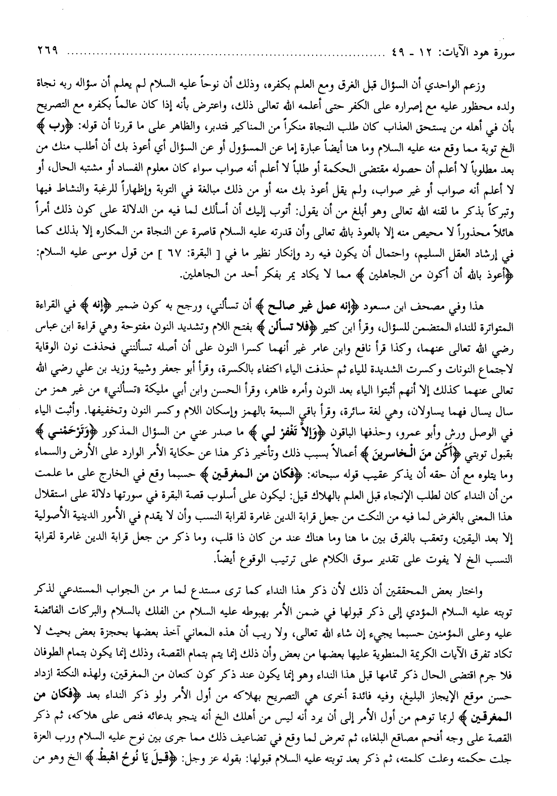 وزعم الواحدي أن السؤال قبل الغرق ومع العلم بكفره، وذلك أن نوحا عليه السلام لم يعلم أن سؤاله ربه نجاة ولده محظور عليه مع إصراره على الكفر حتى أعلمه الله تعالى ذلك، واعترض بأنه إذا كان عالما بكفره مع التصريح بأن في أهله من يستحق العذاب كان طلب النجاة منكرا من المناكير فتدبر، والظاهر على ما قررنا أن قوله: رَبِّ إلخ توبة مما وقع منه عليه السلام وما هنا أيضا عبارة إما عن المسئول أو عن السؤال أي أعوذ بك أن أطلب منك من بعد مطلوبا لا أعلم أن حصوله مقتضى الحكمة أو طلبا لا أعلم أنه صواب سواء كان معلوم الفساد أو مشتبه الحال، أو لا أعلم أنه صواب أو غير صواب، ولم يقل أعوذ بك منه أو من ذلك مبالغة في التوبة وإظهارا للرغبة والنشاط فيها وتبركا بذكر ما لقنه الله تعالى وهو أبلغ من أن يقول: أتوب إليك أن أسألك لما فيه من الدلالة على كون ذلك أمرا هائلا محذورا لا محيص منه إلا بالعوذ بالله تعالى وأن قدرته عليه السلام قاصرة عن النجاة من المكاره إلا بذلك كما في إرشاد العقل السليم، واحتمال أن يكون فيه رد وإنكار نظير ما في [البقرة: 67] من قول موسى عليه السلام: