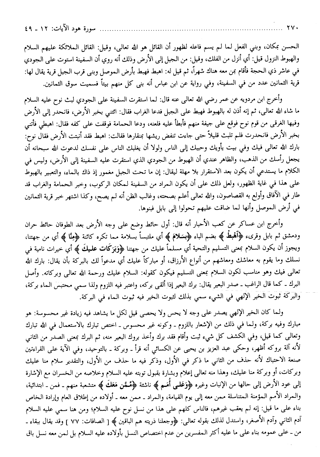 ولما كان الخير الإلهي يصدر على وجه لا يحس ولا يحصى قيل لكل ما يشاهد فيه زيادة غير محسوسة: هو مبارك وفيه بركة، ولما في ذلك من الإشعار باللزوم- وكونه غير محسوس- اختص تبارك بالاستعمال في الله تبارك وتعالى كما قيل: وفي الكشف كل شيء ثبت وأقام فقد برك وأخذ بروك البعير منه، ثم البرك بمعنى الصدر من الثاني لأنه آلة بروكه أظهر، وحكى عبد العزيز بن يحيى عن الكسائي أنه قرأ- وبركة- بالتوحيد، وفي الآية على القراءتين صنعة الاحتباك لأنه حذف من الثاني ما ذكر في الأول، وذكر فيه ما حذف من الأول، والتقدير سلام منا عليك وبركات، أو وبركة منا عليك، وهذا منه تعالى إعلام وبشارة بقبول توبته عليه السلام وخلاصه من الخسران مع الإشارة إلى عود الأرض إلى حالها من الإنبات وغيره وَعَلى أُمَمٍ ناشئة مِمَّنْ مَعَكَ متشعبة منهم- فمن- ابتدائية، والمراد الأمم المؤمنة المتناسلة ممن معه إلى يوم القيامة، والمراد- ممن معه- أولاده من إطلاق العام وإرادة الخاص بناء على ما قيل: إنه لم يعقب غيرهم، فالناس كلهم على هذا من نسل نوح عليه السلام ومن هنا سمي عليه السلام آدم الثاني وآدم الأصغر، واستدل لذلك بقوله تعالى: وَجَعَلْنا ذُرِّيَّتَهُ هُمُ الْباقِينَ [الصافات: 77] وقد يقال ببقاء- من- على عمومه بناء على ما عليه أكثر المفسرين من عدم اختصاص النسل بأولاده عليه السلام بل لمن معه نسل باق