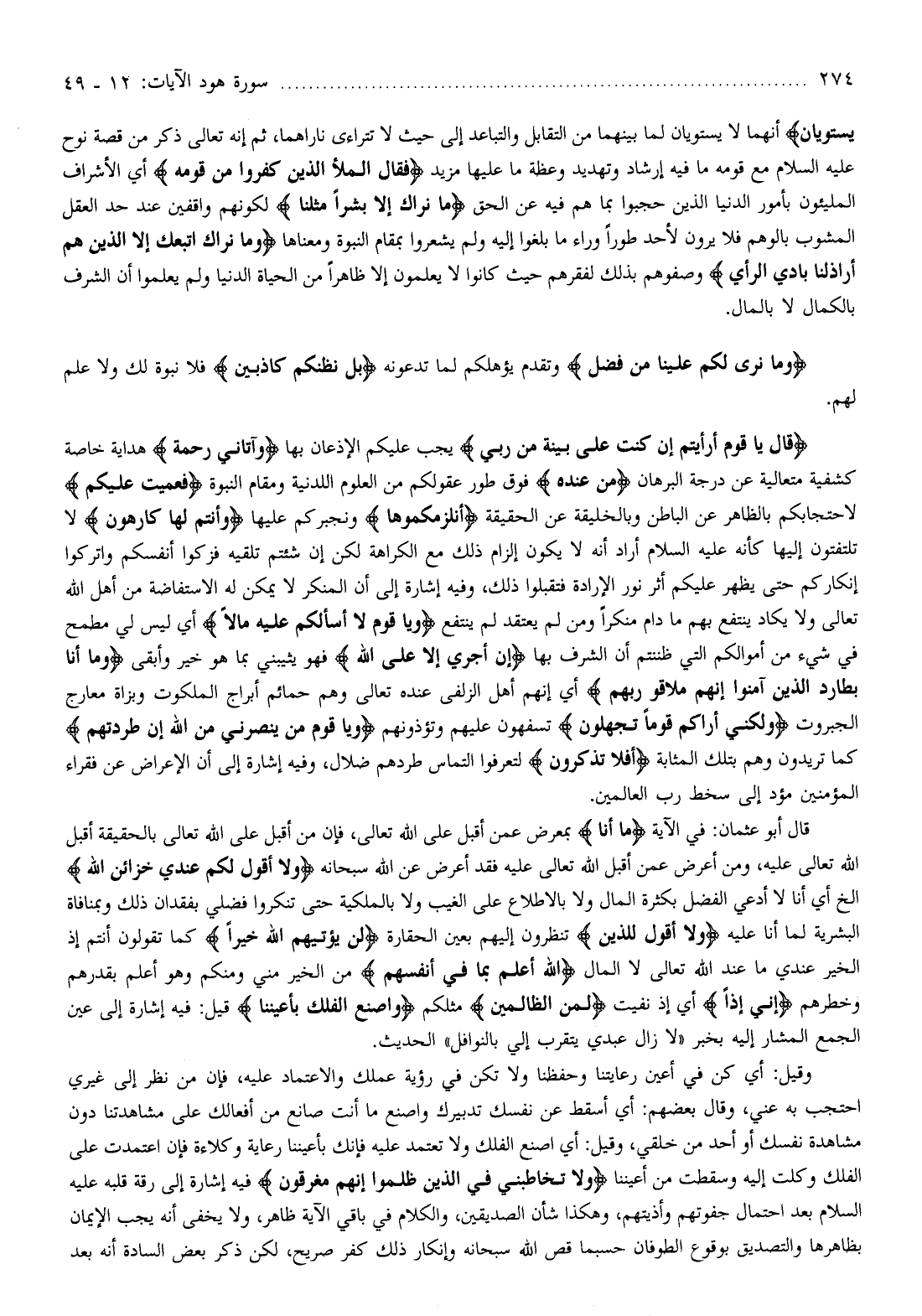 أنهما لا يستويان لما بينهما من التقابل والتباعد إلى حيث لا تتراءى نارهما، ثم إنه تعالى ذكر من قصة نوح عليه السلام مع قومه ما فيه إرشاد وتهديد وعظة ما عليها مزيد فَقالَ الْمَلَأُ الَّذِينَ كَفَرُوا مِنْ قَوْمِهِ أي الأشراف المليئون بأمور الدنيا الذين حجبوا بما هم فيه عن الحق ما نَراكَ إِلَّا بَشَراً مِثْلَنا لكونهم واقفين عند حد العقل المشوب بالوهم فلا يرون لأحد طورا وراء ما بلغوا إليه ولم يشعروا بمقام النبوة ومعناها وَما نَراكَ اتَّبَعَكَ إِلَّا الَّذِينَ هُمْ أَراذِلُنا بادِيَ الرَّأْيِ وصفوهم بذلك لفقرهم حيث كانوا لا يعلمون إلا ظاهرا من الحياة الدنيا ولم يعلموا أن الشرف بالكمال لا بالمال.