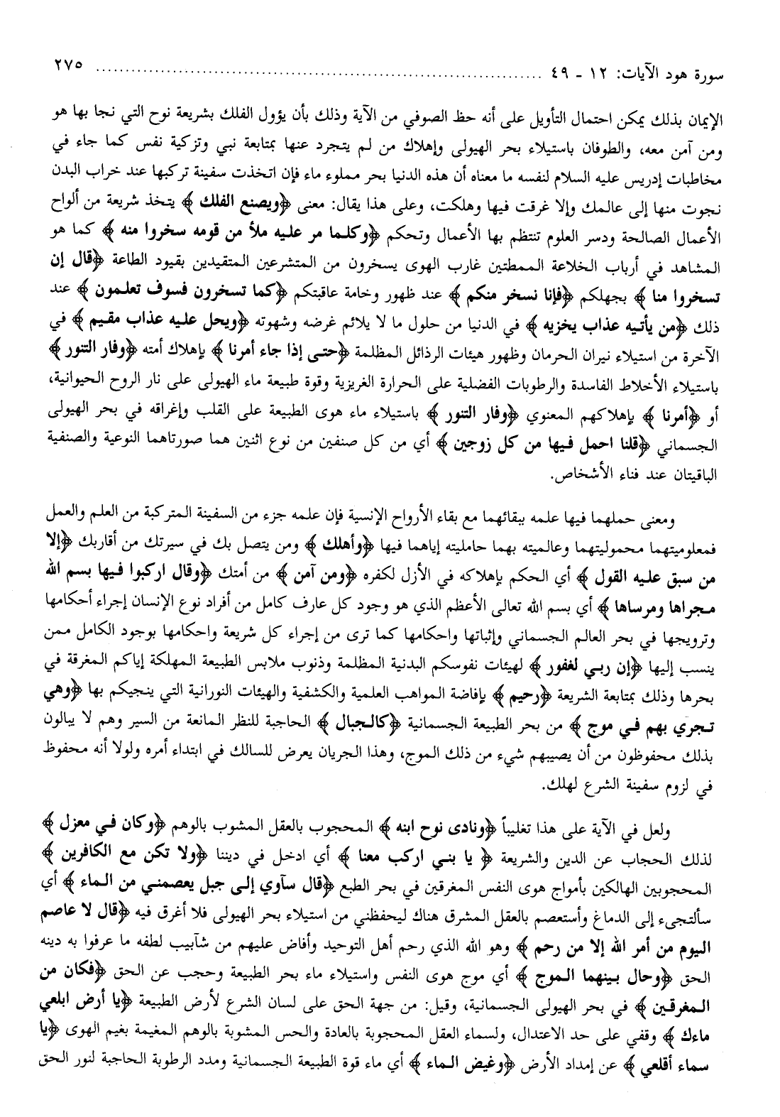 الإيمان بذلك يمكن احتمال التأويل على أنه حظ الصوفي من الآية وذلك بأن يؤول الفلك بشريعة نوح التي نجا بها هو ومن آمن معه، والطوفان باستيلاء بحر الهيولى وإهلاك من لم يتجرد عنها بمتابعة نبي وتزكية نفس كما جاء في مخاطبات إدريس عليه السلام لنفسه ما معناه أن هذه الدنيا بحر مملوء ماء فإن اتخذت سفينة تركبها عند خراب البدن نجوت منها إلى عالمك وإلا غرقت فيها وهلكت، وعلى هذا يقال: معنى وَيَصْنَعُ الْفُلْكَ يتخذ شريعة من ألواح الأعمال الصالحة ودسر العلوم تنتظم بها الأعمال وتحكم وَكُلَّما مَرَّ عَلَيْهِ مَلَأٌ مِنْ قَوْمِهِ سَخِرُوا مِنْهُ كما هو المشاهد في أرباب الخلاعة الممطتين غارب الهوى يسخرون من المتشرعين المتقيدين بقيود الطاعة قالَ إِنْ تَسْخَرُوا مِنَّا بجهلكم فَإِنَّا نَسْخَرُ مِنْكُمْ عند ظهور وخامة عاقبتكم كَما تَسْخَرُونَ فَسَوْفَ تَعْلَمُونَ عند ذلك مَنْ يَأْتِيهِ عَذابٌ يُخْزِيهِ في الدنيا من حلول ما لا يلائم غرضه وشهوته وَيَحِلُّ عَلَيْهِ عَذابٌ مُقِيمٌ في الآخرة من استيلاء نيران الحرمان وظهور هيئات الرذائل المظلمة حَتَّى إِذا جاءَ أَمْرُنا بإهلاك أمته وَفارَ التَّنُّورُ باستيلاء الأخلاط الفاسدة والرطوبات الفضلية على الحرارة الغريزية وقوة طبيعة ماء الهيولى على نار الروح الحيوانية، أو أَمْرُنا بإهلاكهم المعنوي وَفارَ التَّنُّورُ باستيلاء ماء هوى الطبيعة على القلب وإغراقه في بحر الهيولى الجسماني قُلْنَا احْمِلْ فِيها مِنْ كُلٍّ زَوْجَيْنِ أي من كل صنفين من نوع اثنين هما صورتاهما النوعية والصنفية الباقيتان عند فناء الأشخاص.