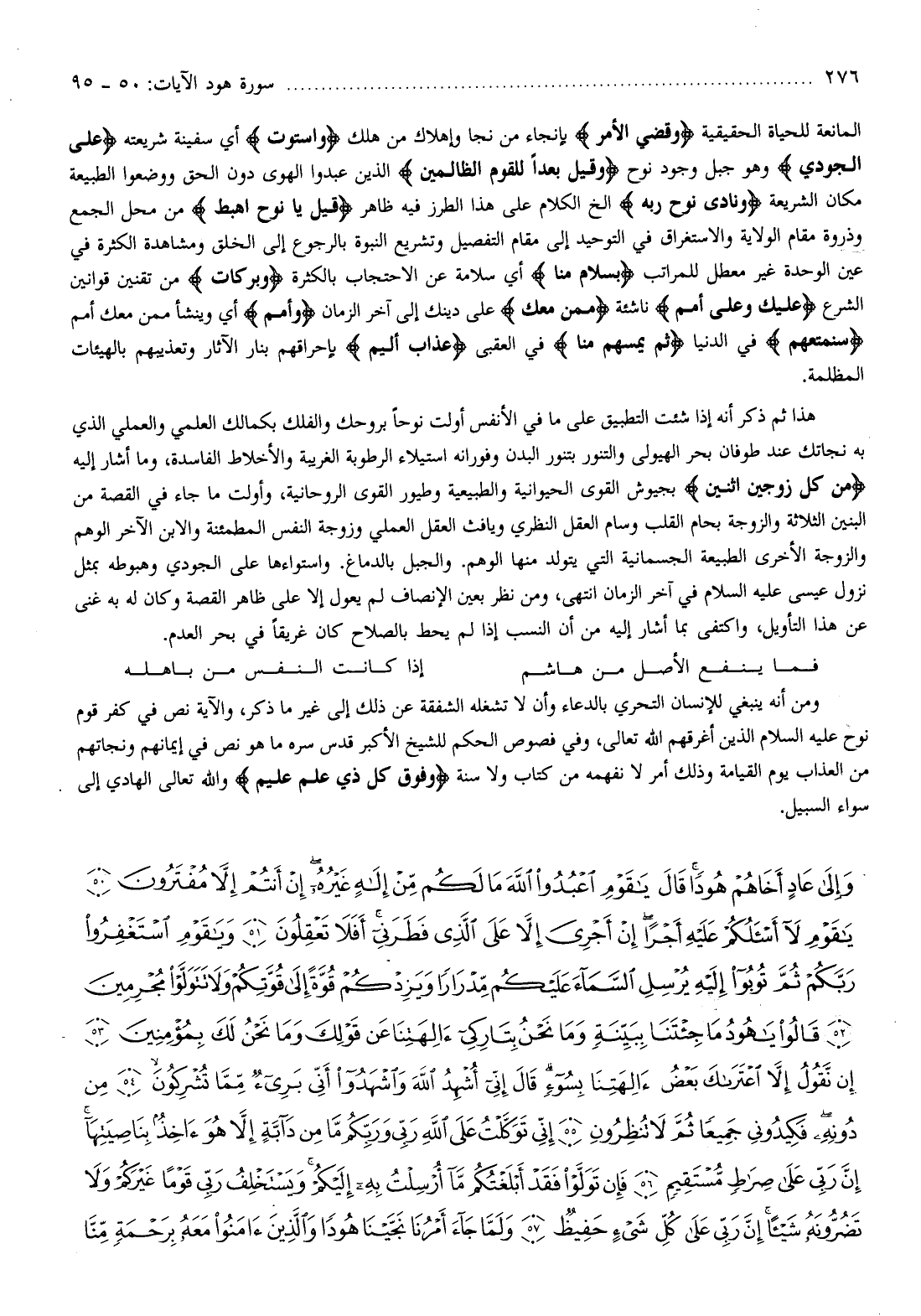 هذا ثم ذكر أنه إذا شئت التطبيق على ما في الأنفس أولت نوحا بروحك والفلك بكمالك العلمي والعملي الذي به نجاتك عند طوفان بحر الهيولى والتنور بتنور البدن وفورانه استيلاء الرطوبة الغريبة والأخلاط الفاسدة، وما أشار إليه مِنْ كُلٍّ زَوْجَيْنِ اثْنَيْنِ بجيوش القوى الحيوانية والطبيعية وطيور القوى الروحانية، وأولت ما جاء في القصة من البنين الثلاثة والزوجة بحام القلب وسام العقل النظري ويافث العقل العملي وزوجة النفس المطمئنة والابن الآخر الوهم والزوجة الأخرى الطبيعة الجسمانية التي يتولد منها الوهم. والجبل بالدماغ. واستواءها على الجودي وهبوطه بمثل نزول عيسى عليه السلام في آخر الزمان انتهى، ومن نظر بعين الإنصاف لم يعول إلا على ظاهر القصة وكان له به غنى عن هذا التأويل، واكتفى بما أشار إليه من أن النسب إذا لم يحط بالصلاح كان غريقا في بحر العدم.