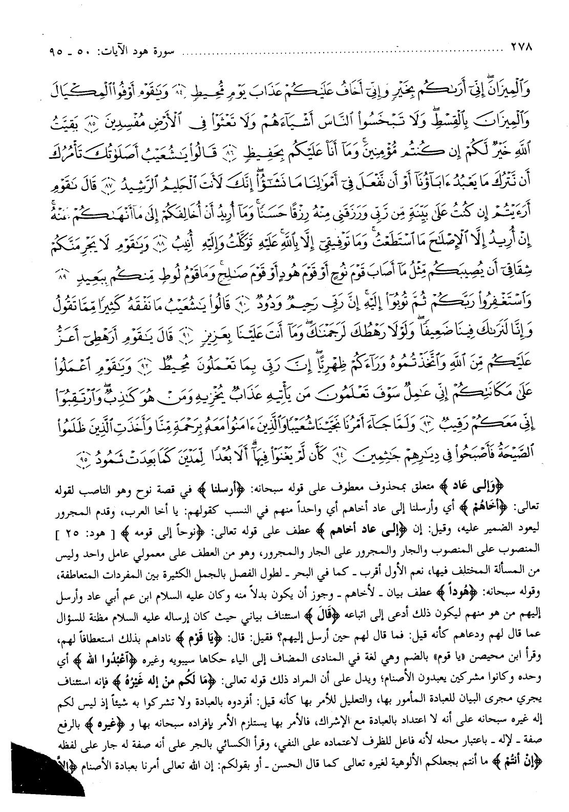 وَإِلى عادٍ متعلق بمحذوف معطوف على قوله سبحانه: أَرْسَلْنا في قصة نوح وهو الناصب لقوله تعالى: أَخاهُمْ أي وأرسلنا إلى عاد أخاهم أي واحدا منهم في النسب كقولهم: يا أخا العرب، وقدم المجرور ليعود الضمير عليه، وقيل: إن إِلى عادٍ أَخاهُمْ عطف على قوله تعالى: نُوحاً إِلى قَوْمِهِ [هود: 25] المنصوب على المنصوب والجار والمجرور على الجار والمجرور، وهو من العطف على معمولي عامل واحد وليس من المسألة المختلف فيها، نعم الأول أقرب- كما في البحر- لطول الفصل بالجمل الكثيرة بين المفردات المتعاطفة، وقوله سبحانه: هُوداً عطف بيان- لأخاهم- وجوز أن يكون بدلا منه وكان عليه السلام ابن عم أبي عاد وأرسل إليهم من هو منهم ليكون ذلك أدعى إليه اتباعه قالَ استئناف بياني حيث كان إرساله عليه السلام مظنة للسؤال عما قال لهم ودعاهم كأنه قيل: فما قال لهم حين أرسل إليهم؟ فقيل: قال: يا قَوْمِ ناداهم بذلك استعطافا لهم، وقرأ ابن محيصن «يا قوم» بالضم وهي لغة في المنادى المضاف إلى الياء حكاها سيبويه وغيره اعْبُدُوا اللَّهَ أي وحده وكانوا مشركين يعبدون الأصنام ويدل على أن المراد ذلك قوله تعالى: ما لَكُمْ مِنْ إِلهٍ غَيْرُهُ فإنه استئناف يجري مجرى البيان للعبادة المأمور بها، والتعليل للأمر بها كأنه قيل: أفردوه بالعبادة ولا تشركوا به شيئا إذ ليس لكم إله غيره سبحانه على أنه لا اعتداد بالعبادة مع الإشراك، فالأمر بها يستلزم الأمر بإفراده سبحانه بها وغَيْرُهُ بالرفع صفة- لإله- باعتبار محله لأنه فاعل للظرف لاعتماده على النفي، وقرأ الكسائي بالجر على أنه صفة له جار على لفظه إِنْ أَنْتُمْ ما أنتم بجعلكم الألوهية لغيره تعالى كما قال الحسن- أو بقولكم: إن الله تعالى أمرنا بعبادة الأصنام إِلَّا